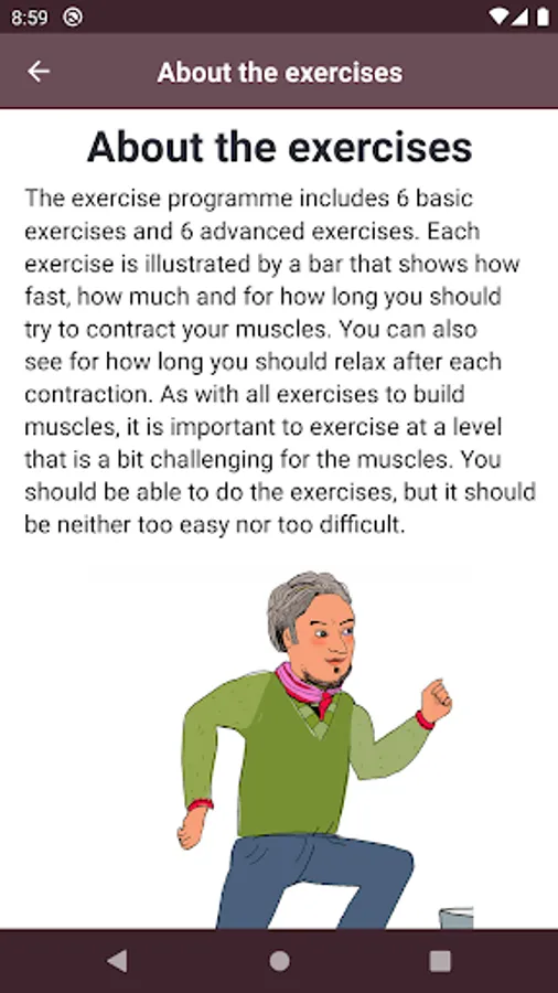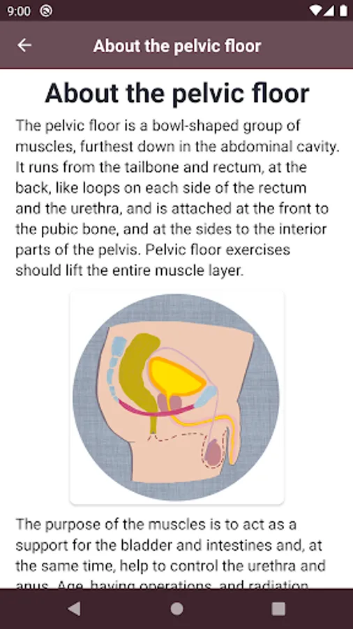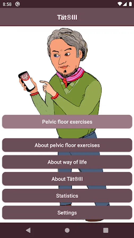 The Tät®III app provides a pelvic floor muscle training programme in six basic and six advanced levels, with increasing severity. Four different kinds of “contractions” are described. The app includes visual aids for each level of training, a statistics function and the ability to create reminders. The app also includes information about the pelvic floor, prostate cancer operations and urinary incontinence. There is information about factors that affect incontinence.