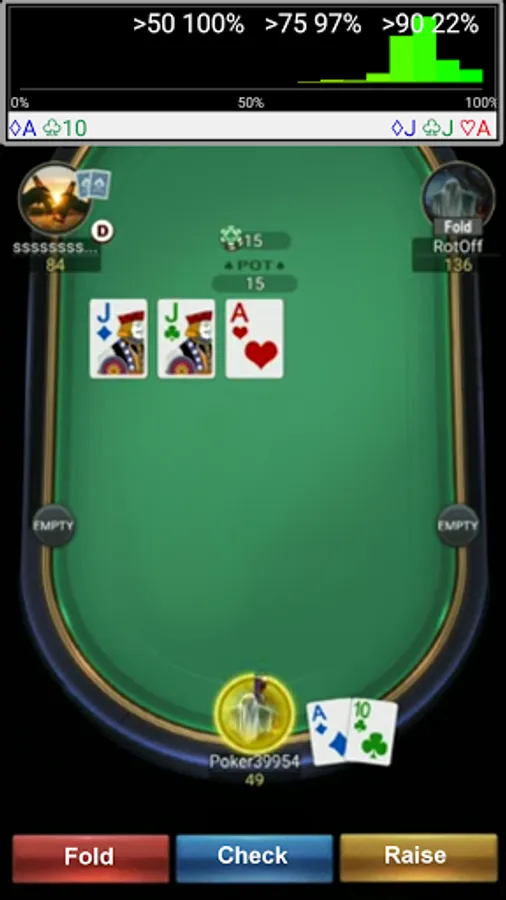 As soon as the app sees any poker cards on your screen it will interpret which are your cards and which are common cards and begin calculating probabilities.