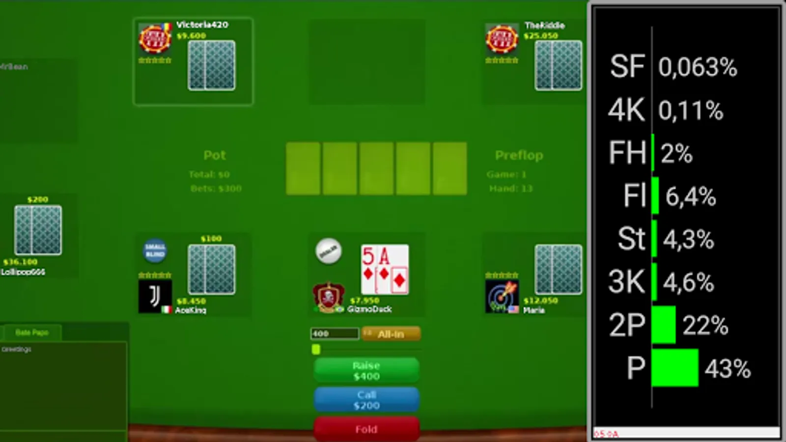 Now you have a small window floating on top of all other apps with a chart showing the probabilities in percentages that you will end up with a certain hand, such as Straight Flush, Four of a kind, Full House, etc.