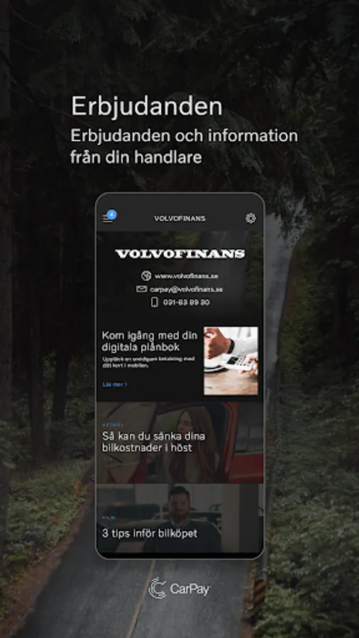 If you finance your car via Volvofinans Bank, you will receive information about your loan or lease through the app.