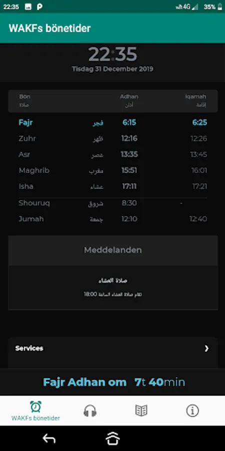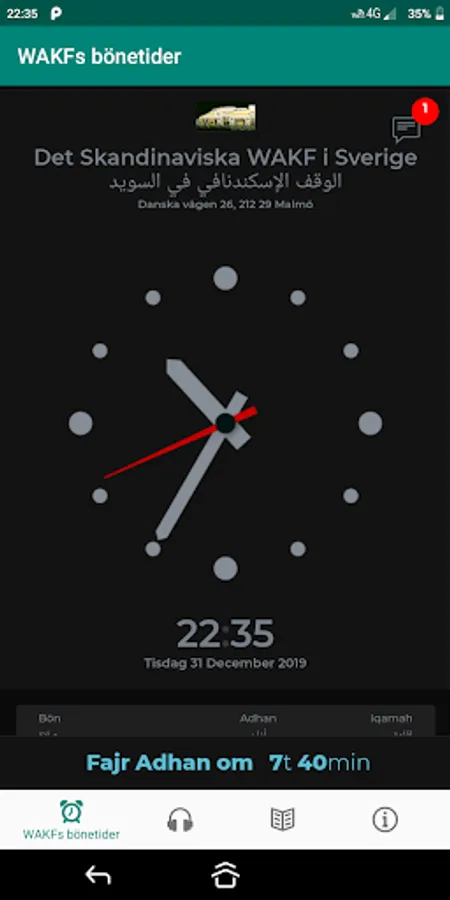 The app is a source of communication between the non-profit organization Scandinavian WAKF in Sweden and all members of society. The app will be used to, among other things, remind members of prayer times and services offered by WAKF. It will also be used to send rejections to members about the activities organized by WAKF. In addition, there will be direct links for simultaneous interpretation of Friday sermon and for counseling.