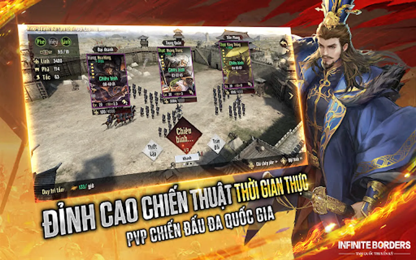 - The function of drawing cards to place unique generals with many variations and unpredictable combinations. The army is strong, the army is full, it is still difficult to become the hegemony. - Tactical game set in the context of the Three Kingdoms of War, realistically recreating combat on the battlefield using strong generals and unique strategies. - Three Kingdoms legendary strategy - period of turmoil, mainly raising troops, strengthening strongholds, recruiting soldiers forever, linking allied forces, increasing personal strength - attacking enemy cities - Tactics away from school. - Chan Long proclaimed emperor - commanded famous generals - recruited tiger generals Quan Van Truong (Quan Vu), Lu Bo or conspirators Khong Minh, Chu Du and more than 300 famous generals and beautiful women of the three kingdoms. - 5 warring factions (Wei, Thuc, Ngo, Han, Hung) with hundreds of strategies of famous generals and armies to counter each other - Crouching Tiger, Hidden Dragon - Unpredictable fighting - Promoting the ability to dominate - Thinking real battle (SLG game). - Attractive war newspaper Ngoai Long (SLG game) - Ton Tu's tactics - highlighting the key things with the army - Tower defense, military training, expedition, national war. - Making alliances - expanding power - claiming to be emperor - king of a 3Q realm - Quan Van Truong. Unify the world - Confess with Infinite Borders: Three Kingdoms Truyen Ky