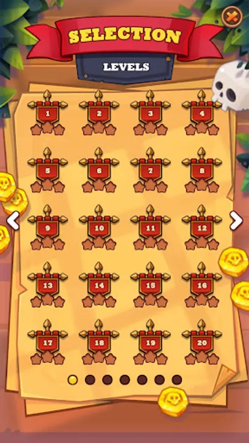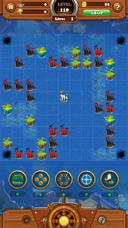 Seven ships battle - Pirates of sea is a top-down strategical arcade puzzle game with a pirate theme, a turn-based game, set on an ocean board of 11x11 squares. Players control a white galleon, boat and need to eliminate all pirate ships to complete a level. For each turn the ship can move in any of the eight squares surrounding the ship, unless blocked by an obstacle. Pirate ships have the same movement options and an identical speed of one square per turn. It is also possible not to move and fire the two broadside cannons to the left and the right of the ship instead, with a maximum reach of three squares.