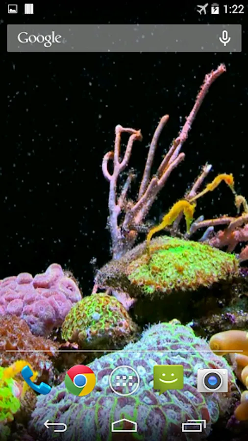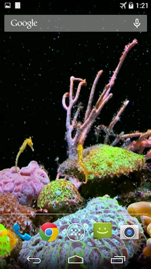 Beautiful live wallpaper with colorful seahorses and corals in fish tank.