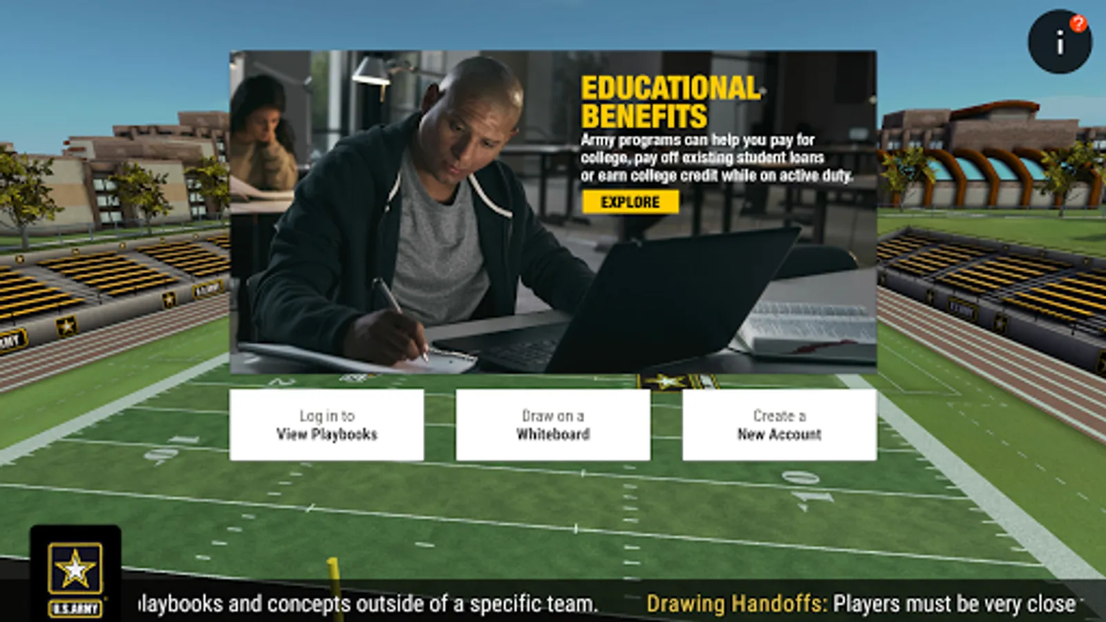 GoArmy Edge Football is a FREE game-changing app created by the U.S. Army, that allows coaches to draw their plays on a digital whiteboard. Get mental reps from the first person perspective or any position on the field with real-time 3D graphics. GoArmy Edge Football comes pre-loaded with many example plays and drills for concepts such as formation recognition and RPO reads. GoArmy Edge Football gives coaches the ability to organize their formations and plays into virtual flashcard drills to teach and test their players.