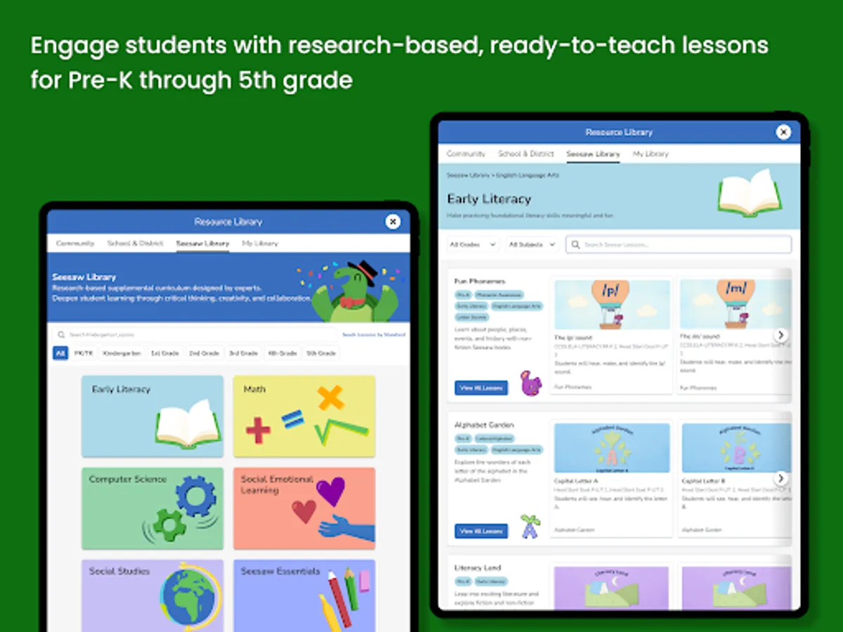 - Over 1600 research-based and ready-to-teach lessons created by Seesaw’s curriculum experts with whole group instruction videos, 1:1 or small group practice activities and formative assessments. Includes robust lesson plans to support teacher implementation.
