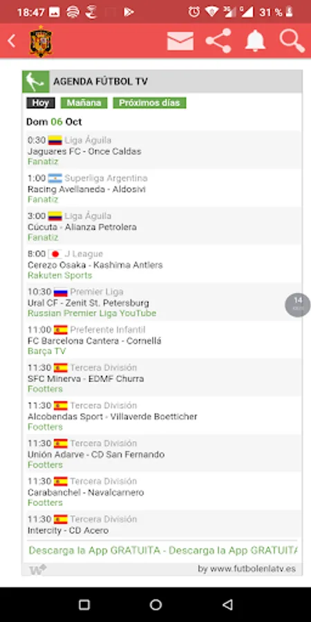 - Free alerts. Notifications or free messages that we will send you through our app to your mobile phone of the matches that will be televised in the next few hours., (To receive them you will have to always have the app open in the background)