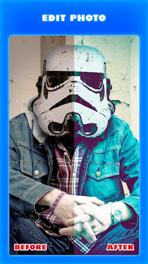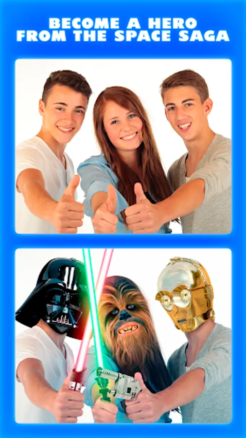 -Take your photos to the next level with our impressive camera effects. Become the hero of a famous saga by trying on various face masks and stickers of light saber inspired by your favorite space characters. From dashing rebels to formidable villains, you can embody them all thanks to our photo editor free.