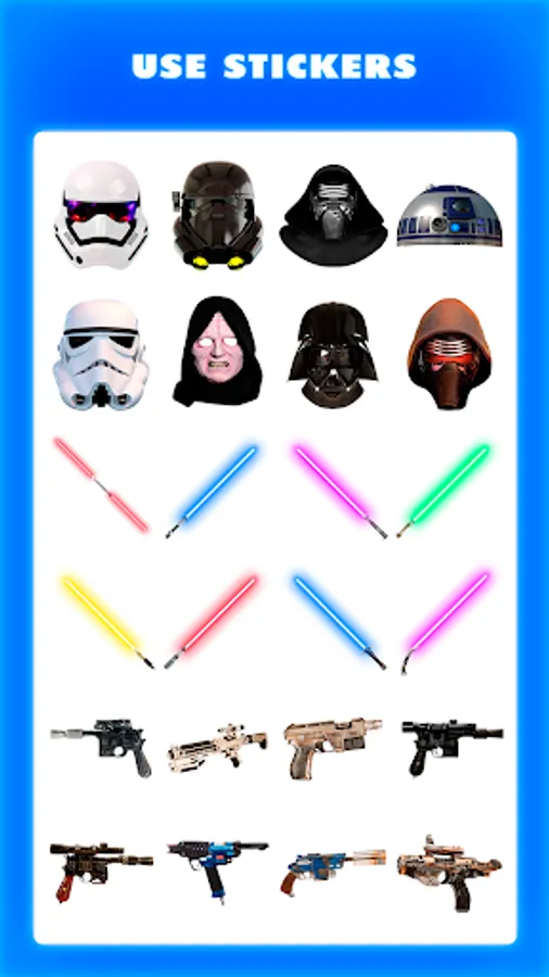 -Try our weapon stickers and filters in the boys photo editor to feel like a real star warrior, allowing you to arm yourself with iconic galactic weapons like blasters and lightsabers. Customize your hero photos with filters for pictures such as light saber, adding a thrilling dimension to your interstellar adventures. Whether you're fighting for the Rebellion or embracing the dark side, our lightsaber app with camera effects will make you feel like a true space hero.