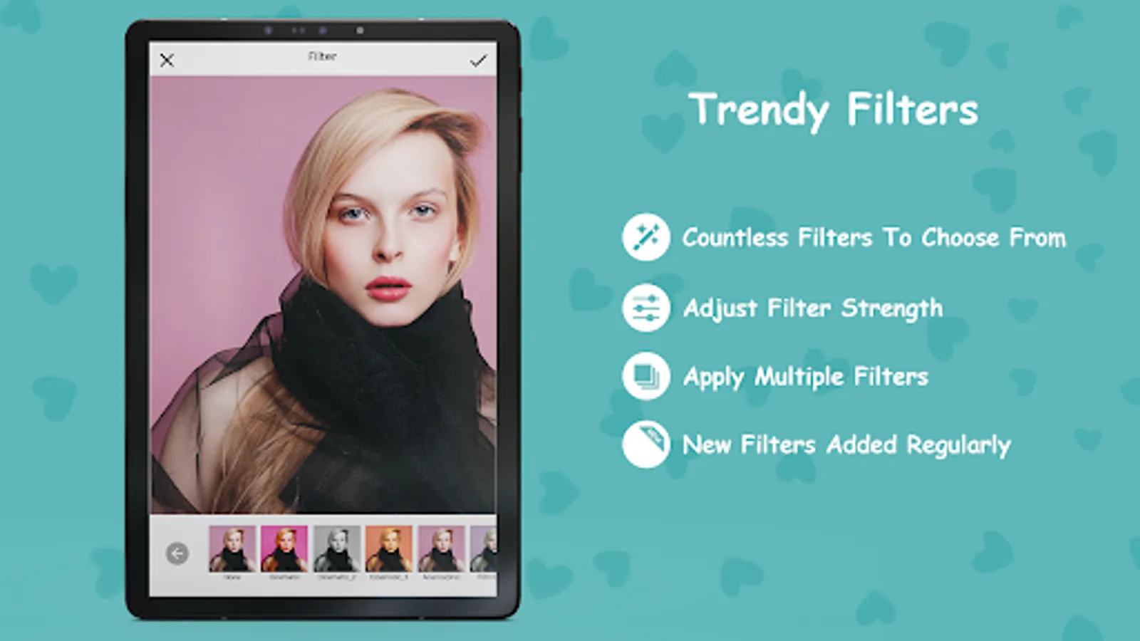 Choose from a variety of trendy filters and create Insta-worthy pics effortlessly using our photo editor app.