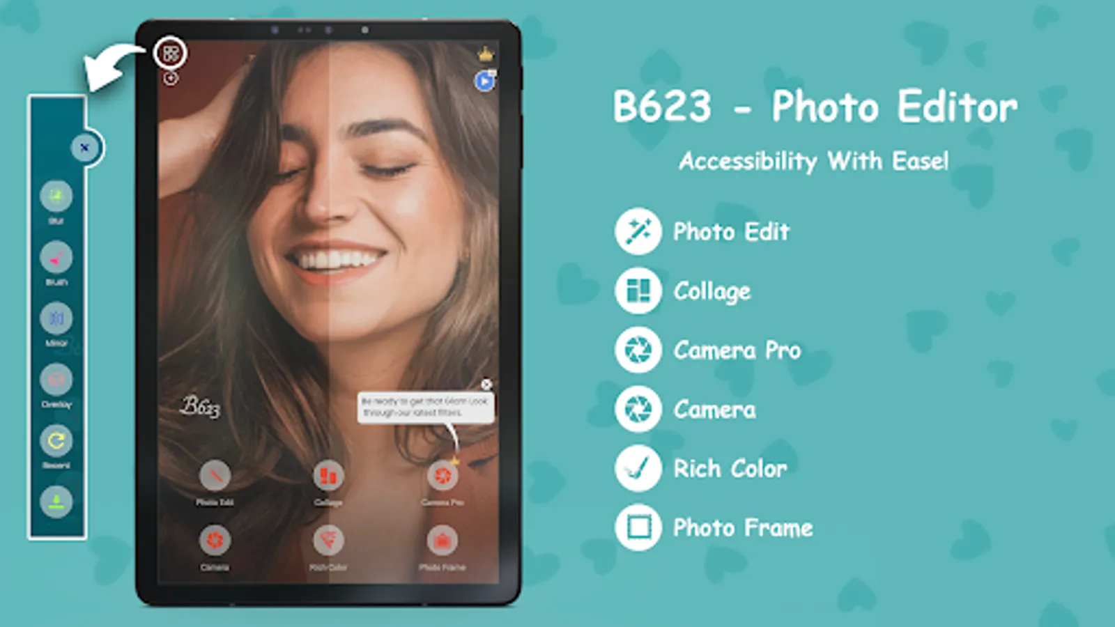 B623 Selfie Beauty Camera app takes your photo editing skills to the next level. Create cool photo collages, add text & cute stickers, apply trendy filters, and change background with this feature-pack selfie camera app.