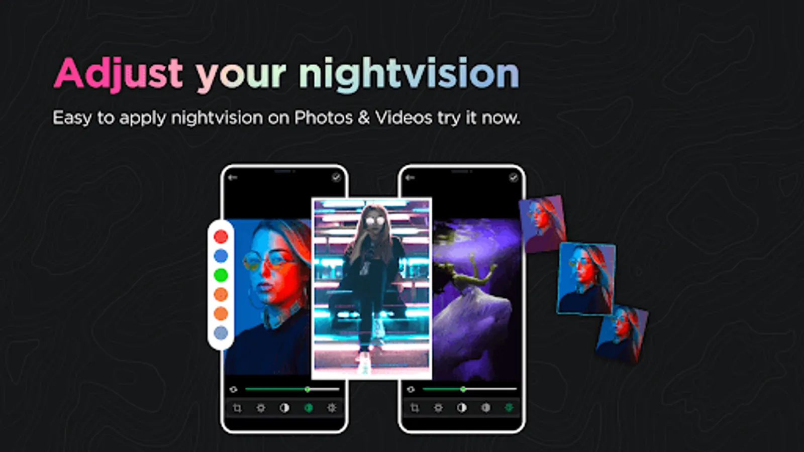 Selfiecut NightVision Effects is your gateway to a world of stunning night photography. Capture captivating selfies and videos in the dark with our powerful Night Vision Camera effect. Create art with our Dark Effects Camera, complete with Night Filters for perfect nighttime photos. Enjoy auto adjustments, vibrant colors, and high-quality images. Record and play back HD videos, use front and rear cameras, and zoom up to 8x. Set auto timers, explore green amplification mode, and enhance your content with live Camera Filter Effects. Elevate your photography with the Photo Video Slider. Download now and unlock the magic of the night