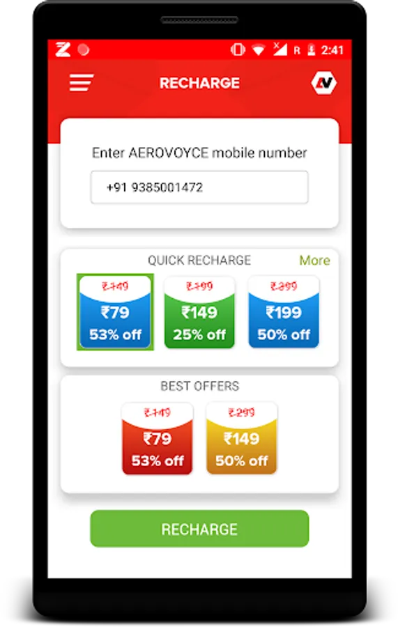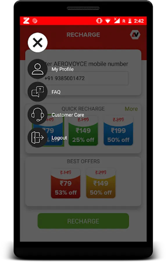 On homepage we have options to recharge for Voice,Data and SMS via net banking, credit/debit cards.Recharge App contains the best offers for each AV number and Easy way of recharging anywhere and anytime for AEROVOYCE number.
