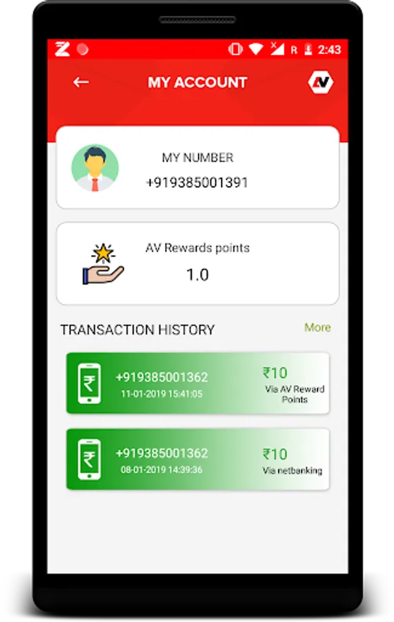 Every transaction details are displayed and User virtual money balance for recharge is displayed and which creates a easy way to manage their recharge balance and maintain their “Recharge Acc” active for 24/7. Easy payments and Easy transactions can be done through the app and Loading Recharge money is way more easy in AV Recharge App.