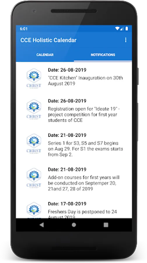 An interactive holistic calendar for the students of Christ College of Engineering to know about the latest events and programmes conducted by the college. The app also features a real-time notification system so that you're never out of the loop.