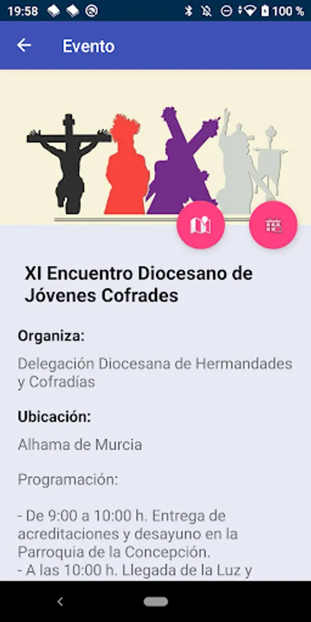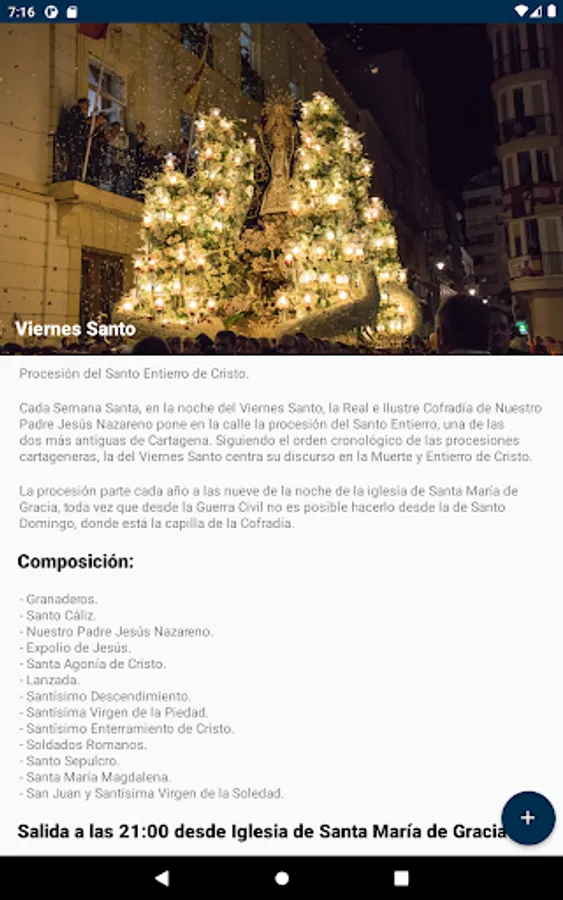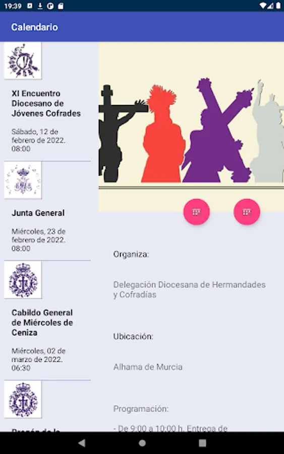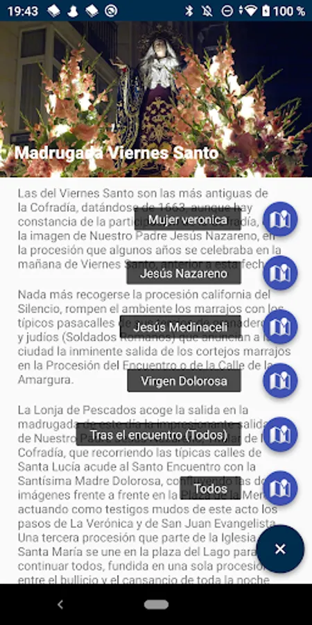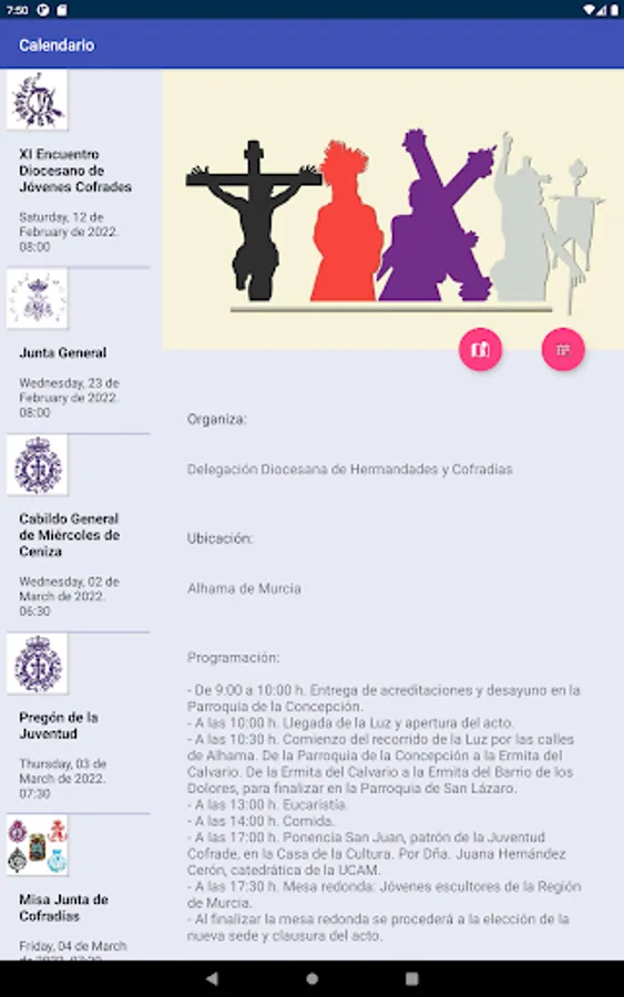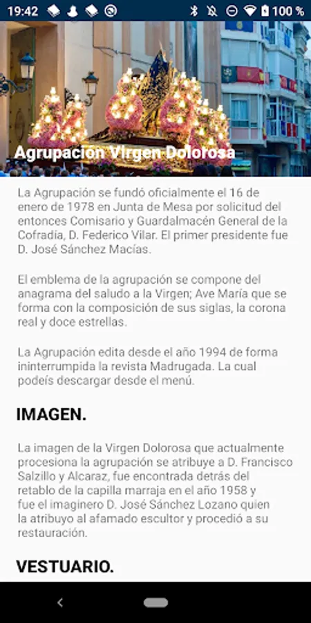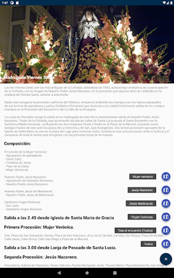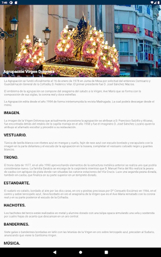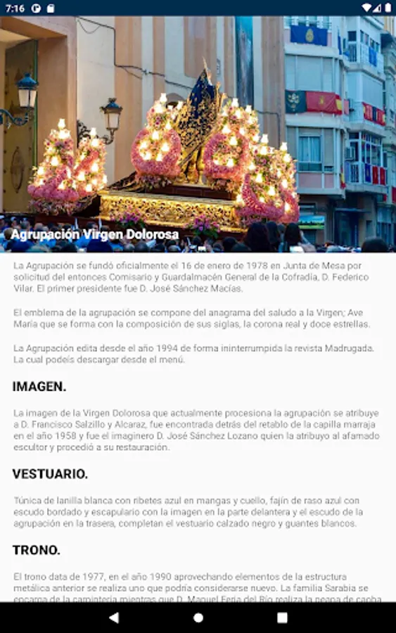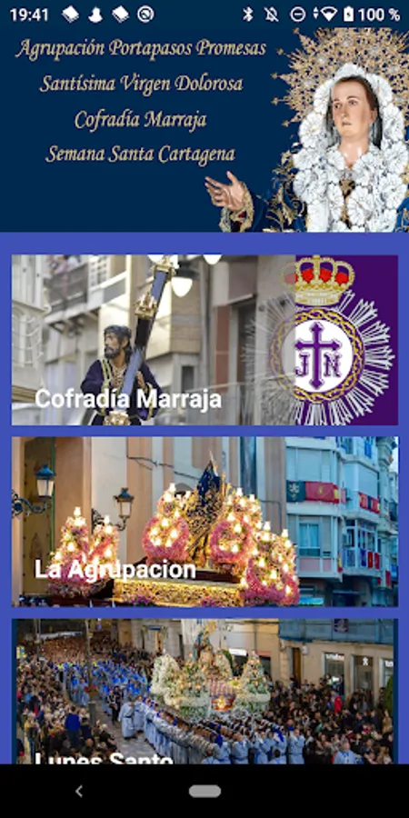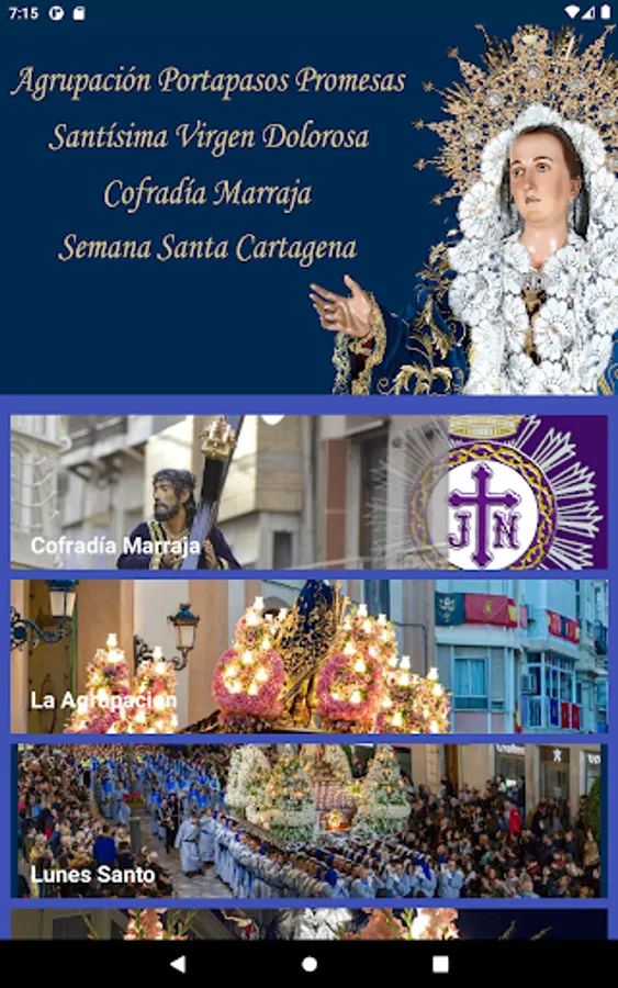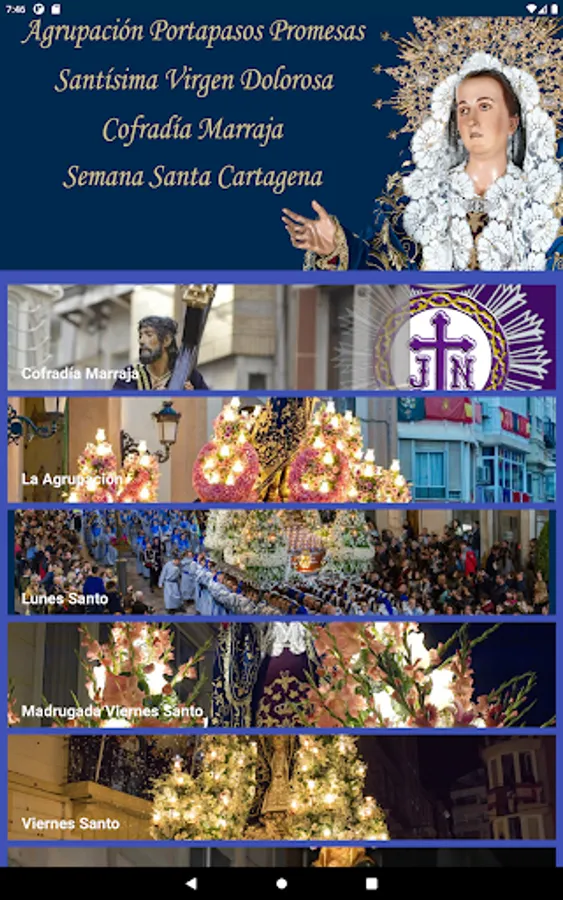 Application designed to disseminate the activities of the Association of Portapasos Promises de la Santísima Virgen Dolorosa and the Marraja Brotherhood, during Holy Week in Cartagena. Do not miss any of the processions of the Marraja Brotherhood, with their schedules and itineraries. Consult all the events of our Association and of the Marraja Brotherhood: We notify you of each one of them, so that you do not forget them! Download our Madrugada Magazine. Have fun playing with this puzzle that we propose.