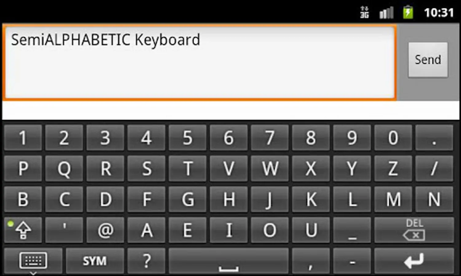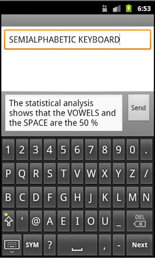 This keyboard has been designed to take advantage of a statistical fact: Statistics show that the VOWELS and SPACE are 50% of characters in English texts,and even more in others languages (54% in Spanish).