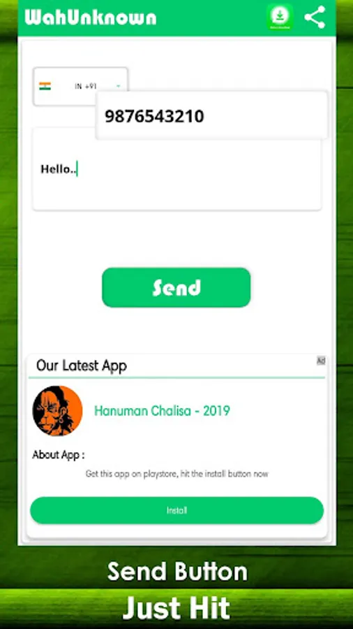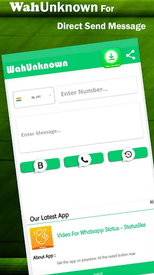 We have got you covered. Now you can quickly send messages to any phone number which are not in your contact list. Use “WahUnknown” App and send direct message to unsaved phone number. WahUnknown app is a convenient app for those who do not want to save a phone number to contacts before they send message.