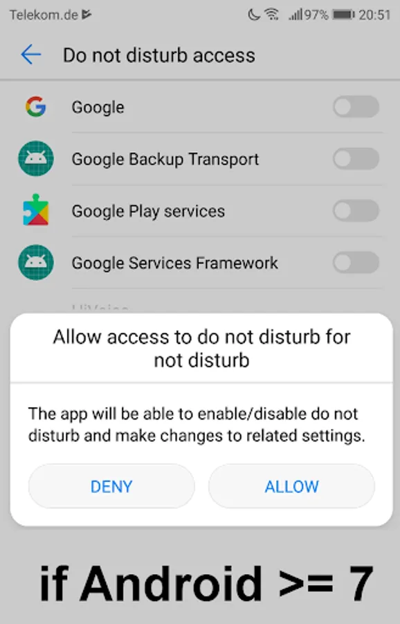 Even applications in the background are muted without flight mode - PIN is not required! This app is similar to the Do Not Disturb feature of newer smartphones - just simpler. From Android 7 (Nougat) there is the function "Do not disturb". Our app focuses on people who use Android <7 and want to mute all channels with one click! The app works on Android 5-10. The user does not have to use the "do not disturb mode" of the smartphone (moon symbol).