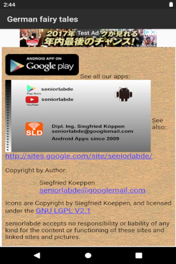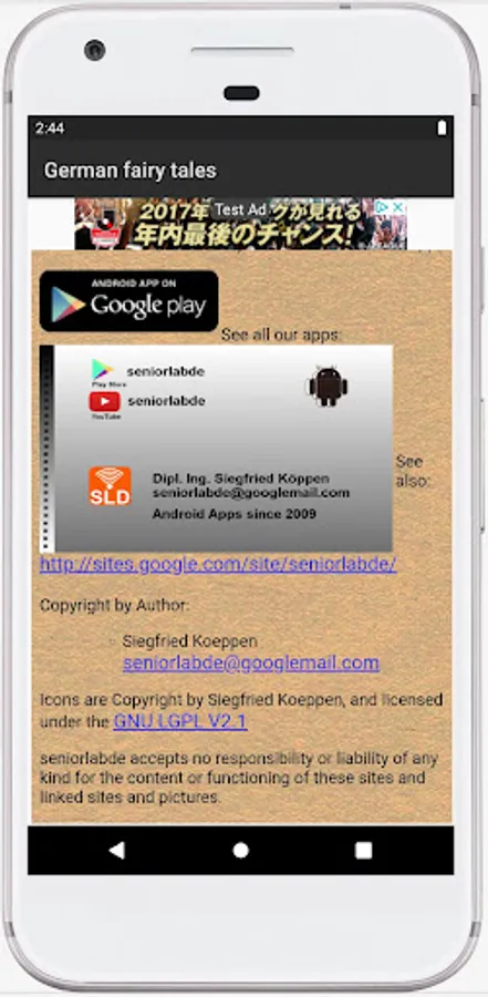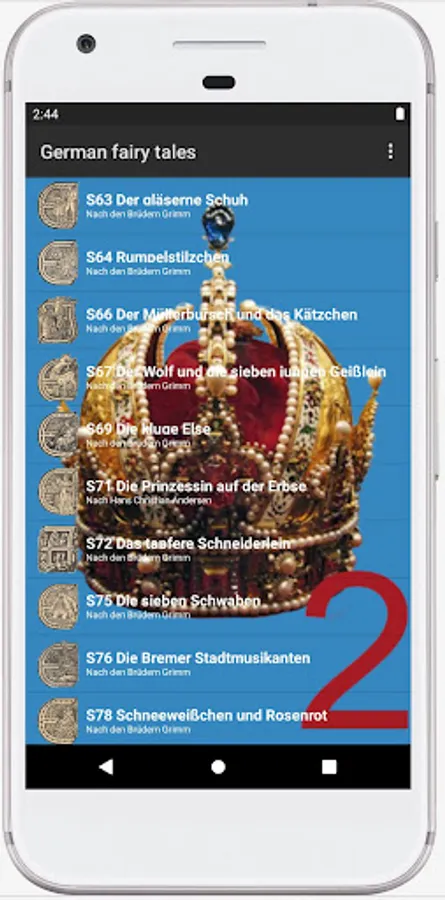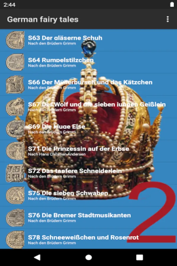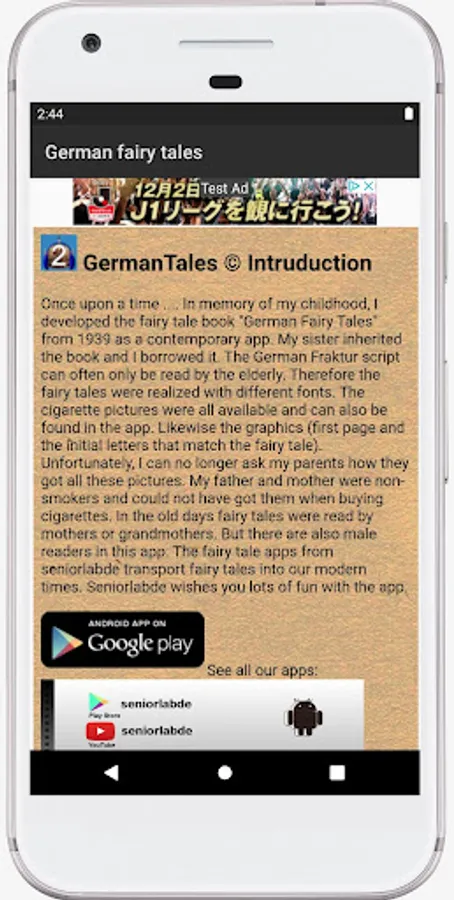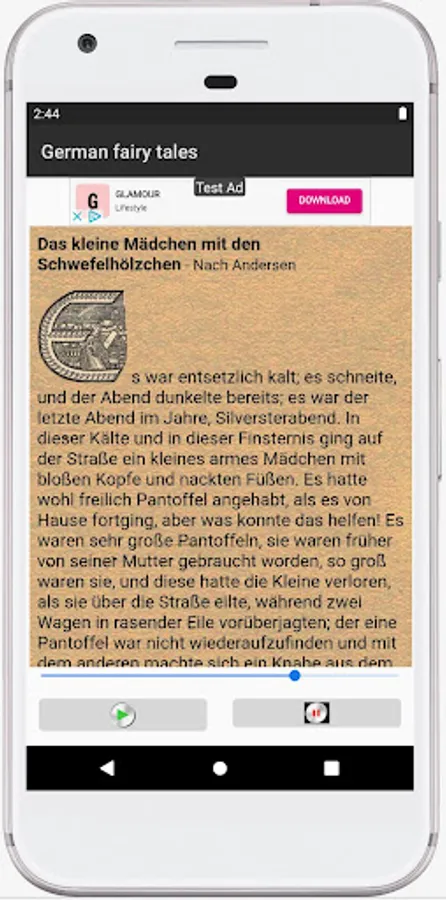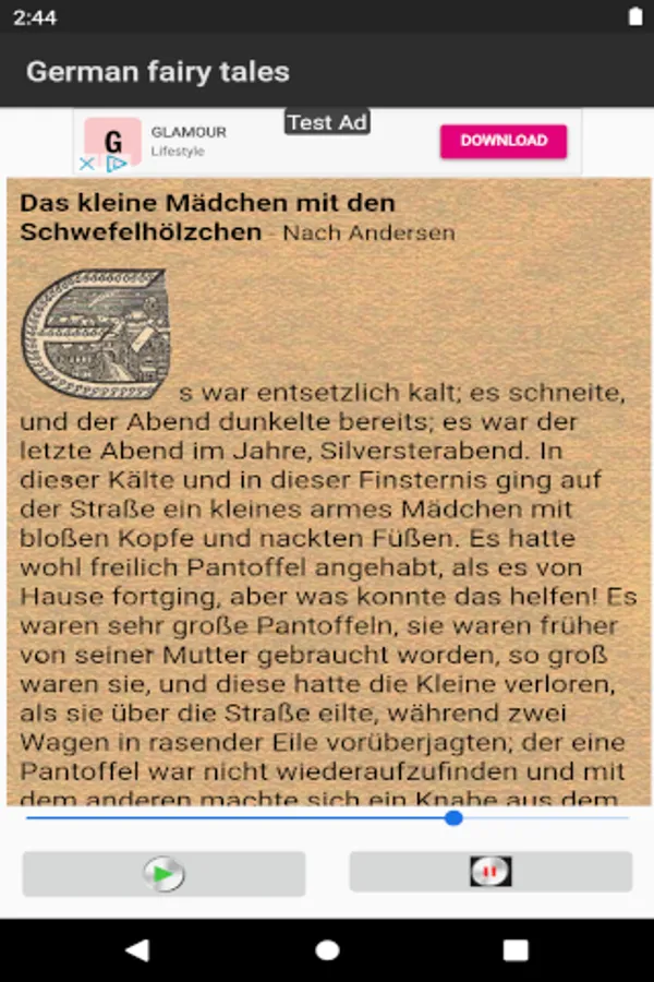 The "German fairy tales audio book" app is a app for everyone who does not or not yet speak the German language. It takes up a lot of storage space because some fairy tales take over 20 minutes to read. Playback can be stopped. Or also be restarted. Unfortunately, some fairy tales are still read out with a generated voice - text to speech. Readers are still being sought so that the fairy tales from the fairy tale book of 1939 can all be read out by a beautiful voice. Get in touch with the developer of the app, who would like to use this app to meet the wishes of many users for a reading option.