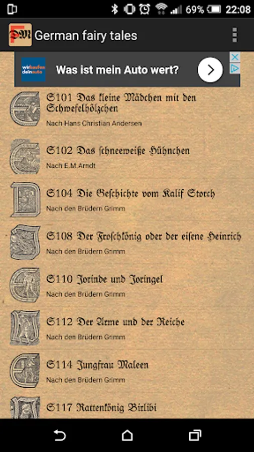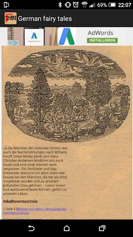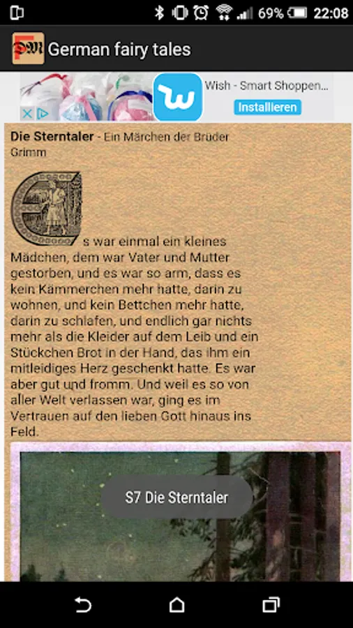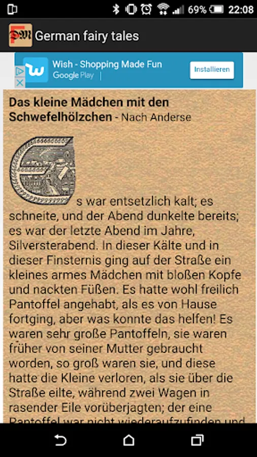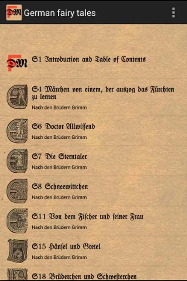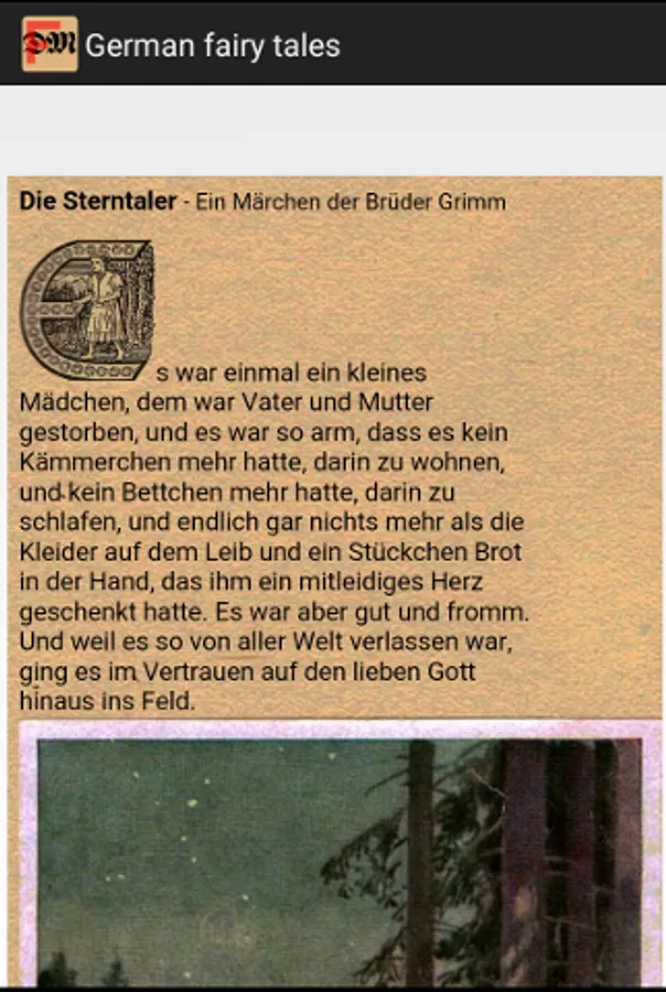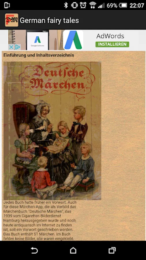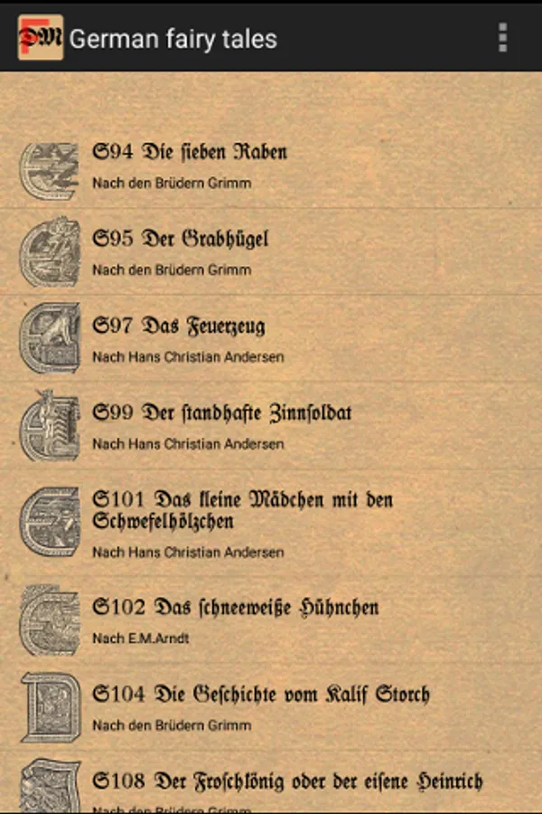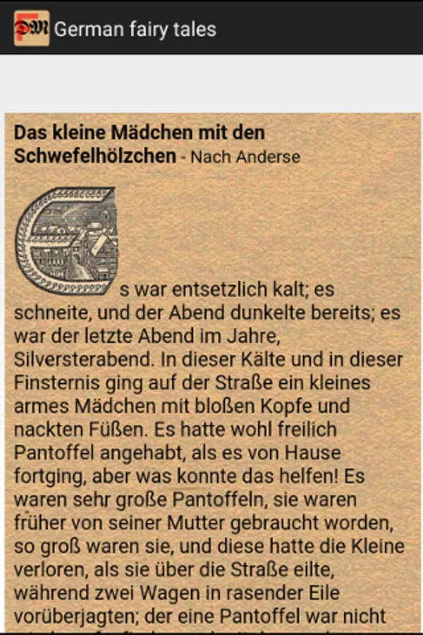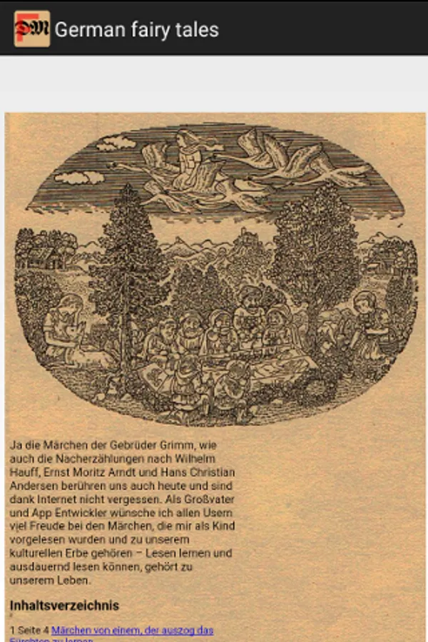 In memory of my childhood, I developed the fairy tale book "German Fairy Tales" from 1939 as an app in keeping with the times. The book inherited my sister and I borrowed it. I give it to my grandchild at the beginning of school. The German Gothic typeface can often read only the elders. Therefore, the fairy tales were realized with other fonts. The cigarette images were all available and can be found in the app again. Likewise the graphics (first page and the fairy-tale matching first letter). Unfortunately I can not ask my parents how they came to all the pictures. My father and mother were non-smokers and could not have gotten them to buy cigarettes. The same book can even be found on the internet at prices from 25 €. Have fun with the app seniorlabde.