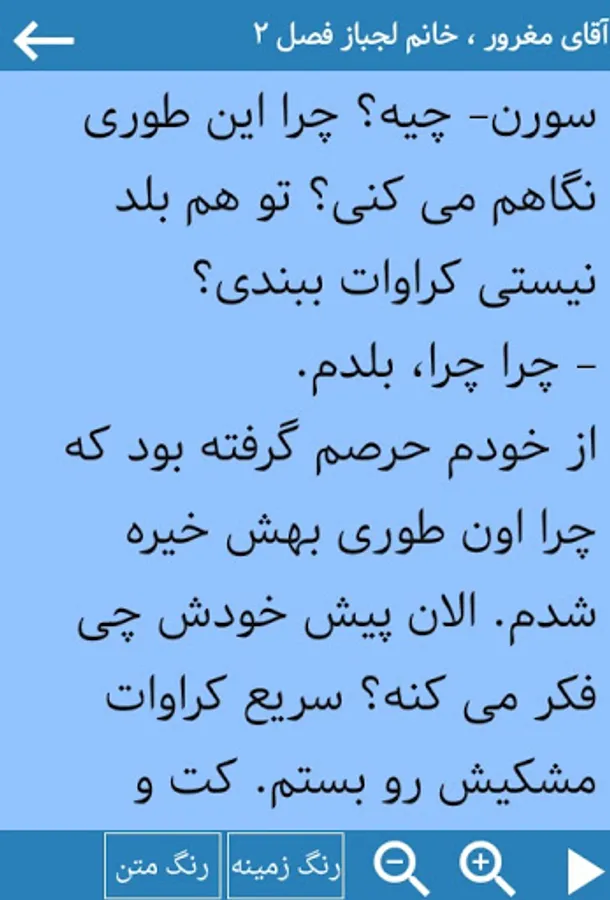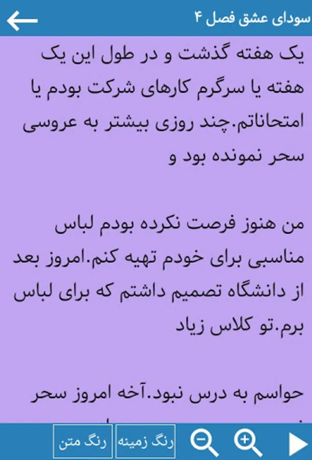 در قسمت تنظیمات میتوانید رنگ زمینه و قلم را طوری انتخاب کنید که از خستگی چشمانتان جلوگیری شود،همچنین امکان تغییر فونت و اندازه قلم هم میسر است.