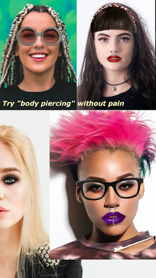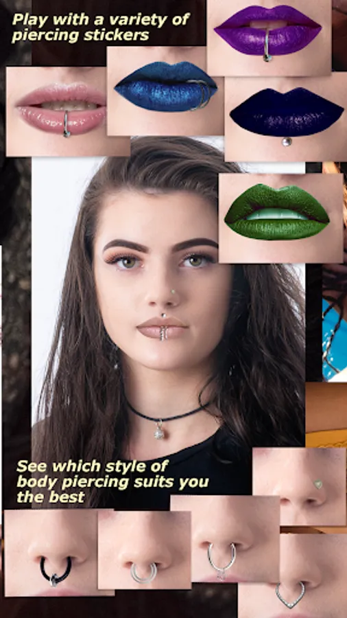 See how face piercings look on you before actually getting pierced. Save yourself some trouble and use this nose piercing photo editor for girls to decide if you want a nose, tongue, lip or eyebrow piercing. Make use of this 💎 Nose Rings Photo Editor - Fake Piercing Camera 💎 to change your face and find your style. Choose among silver, gold, black, pink or colorful face piercings and transform into an egirl. This piercings camera is also a hairstyles editor and a lip colour change editor. Browse through this hair changer app for girls for some hairstyles ideas and turn yourself into a fashionable girl. With this body piercing photo editor and camera filters and effects makeup you can change your look every day. Send your piercings photo montage to your friends and share your style and face transformation on social media apps and wait for people's reactions!