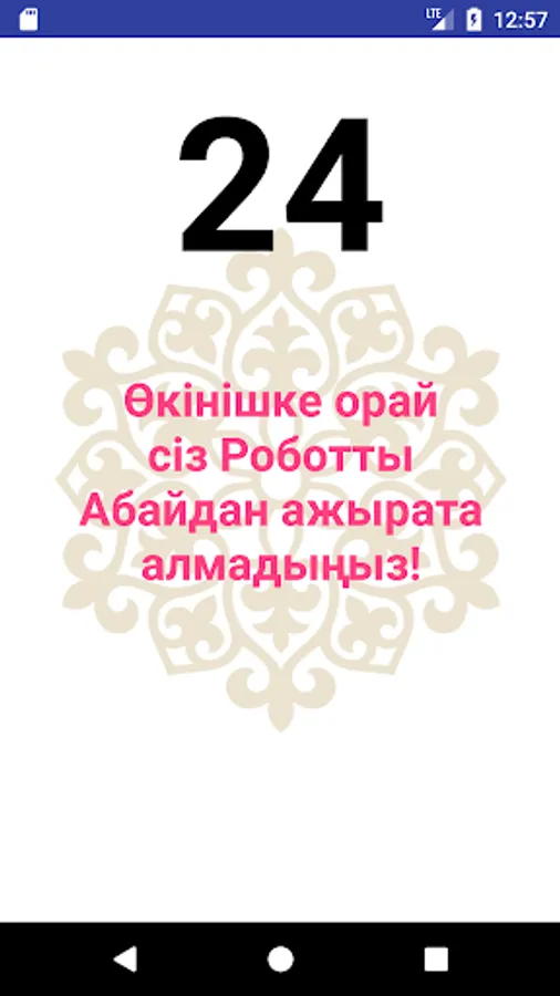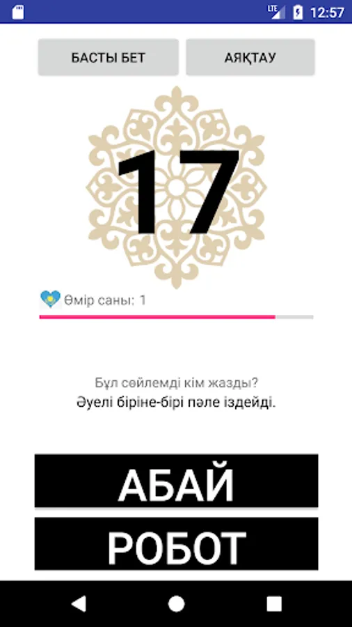 Robot with Artificial Intelligence found Abay's "Book of Words". It liked the book so much, that started to write own sentences and merged it with "Book of Words". Now, everyone who reads Abay's "Book of Words" can not distinguish Abay's sentences from AI's. Therefore, today World needs a Hero more than ever. To find such a brave & intelligent hero we created a game, where you need to identify where the sentence belongs to AI or Abai. The more and faster you answer, the more points you get. You have only 3 chances to loose. Hero will be the one, who got the highest score. Who knows, maybe it is You who should be the Hero. Download and prove!