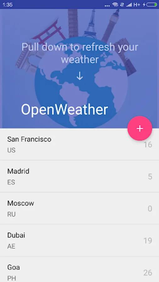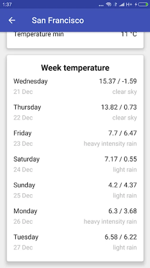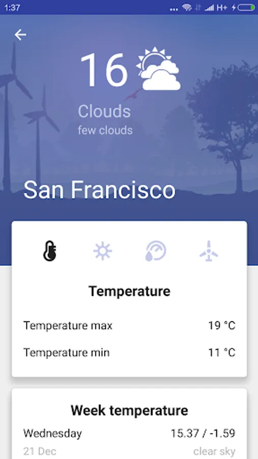 OpenWeather provides such information about the weather, as the current temperature, maximum and minimum temperatures for the current day, time of sunrise and sunset, pressure and humidity, speed and direction of the wind.