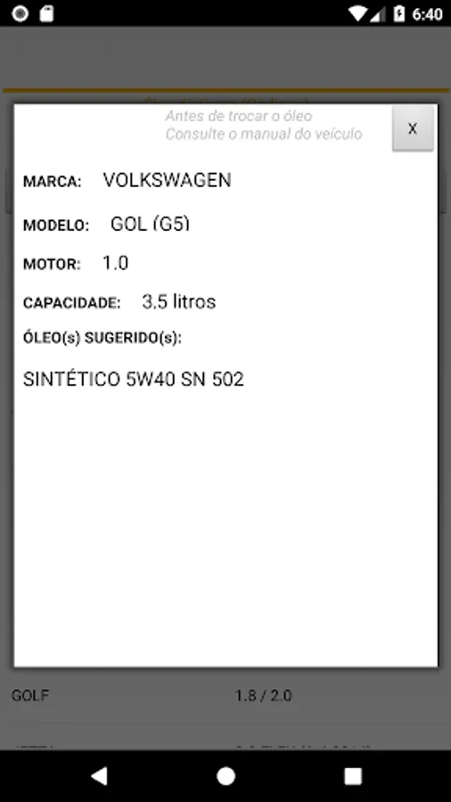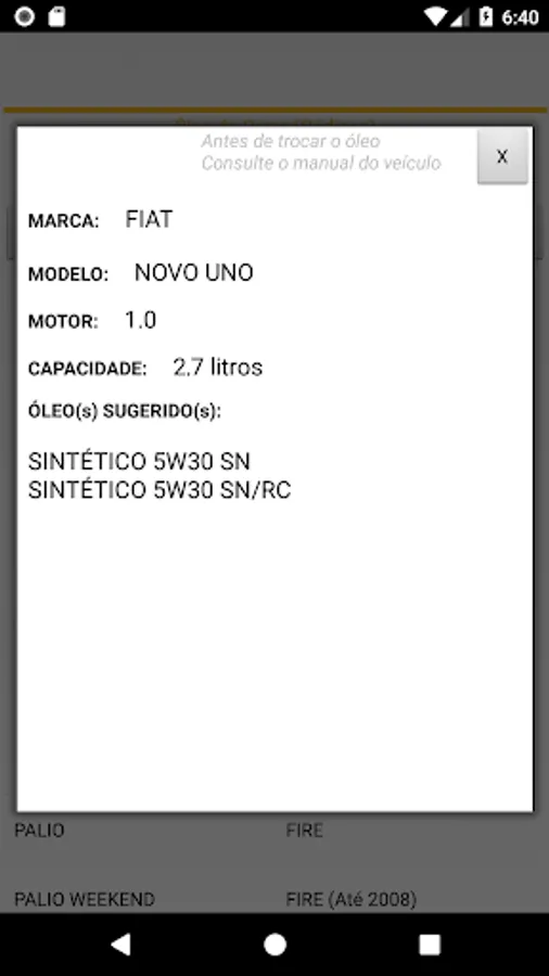 Helps to find vehicle engine oil, viscosity and quantity.