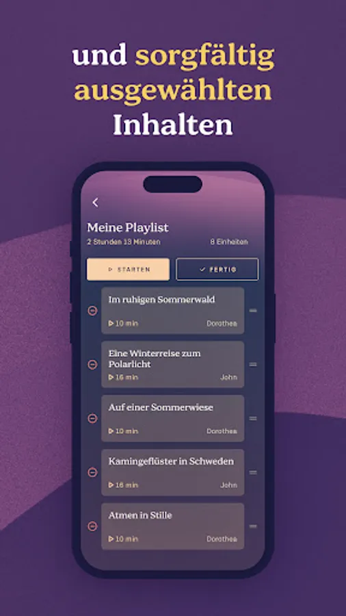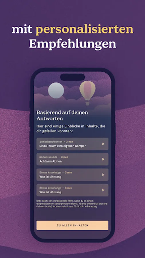 If you are using the 7Sleep app for the first time, we will guide you through three initial questions. These help us to get to know your needs and wishes for 7Sleep better. Based on your answers, we will automatically put together your own personal 7Sleep - with suitable content that could match your sleep difficulties. But don't worry, this compilation is just a suggestion from us! You can also configure the app yourself at any time or get a taste of other content.