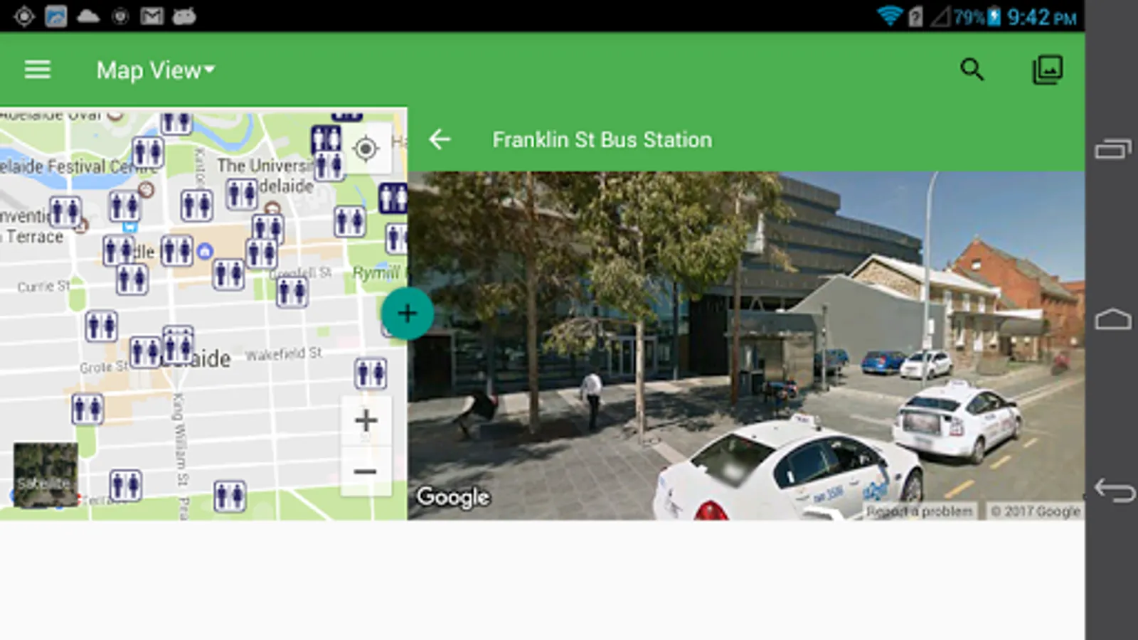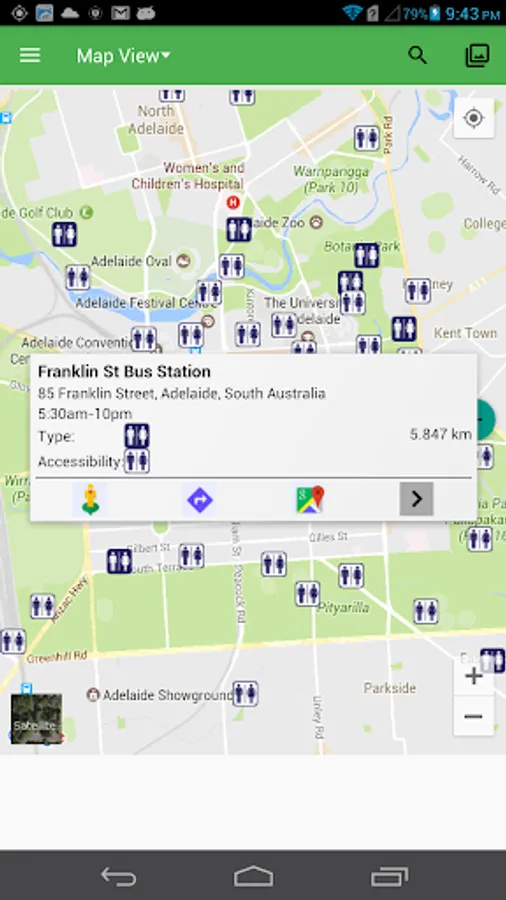 From Map Mode, you can find the nearest, most suitable restrooms for your self in several seconds based on your current location and it can guide you to the destination via Google Route function. You can utilize Google StreetView to confirm whether the toilet is available or not.