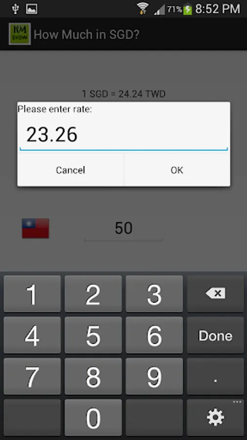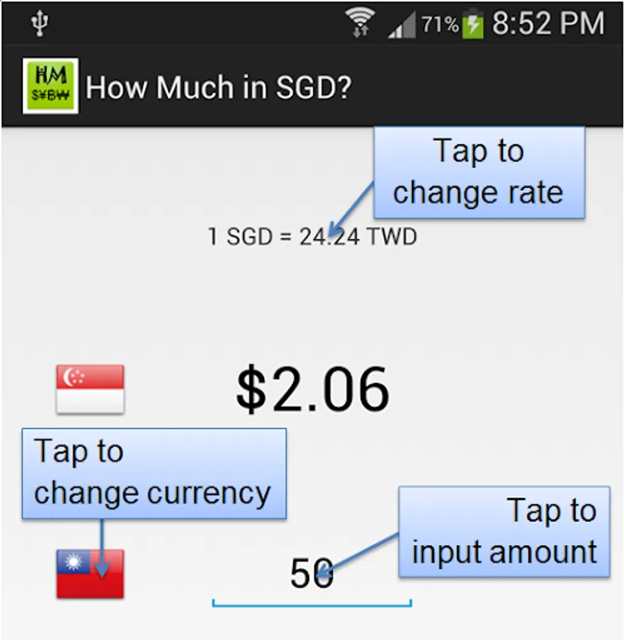 Singaporeans like to travel and shop overseas. You will like to know how much a particular item cost in SGD. Some rely on mental arithmetic (or abacus!), others rely on a calculator. This app makes this easy and fast. You can also set the rate to the amount that you had hoot at your money changer.