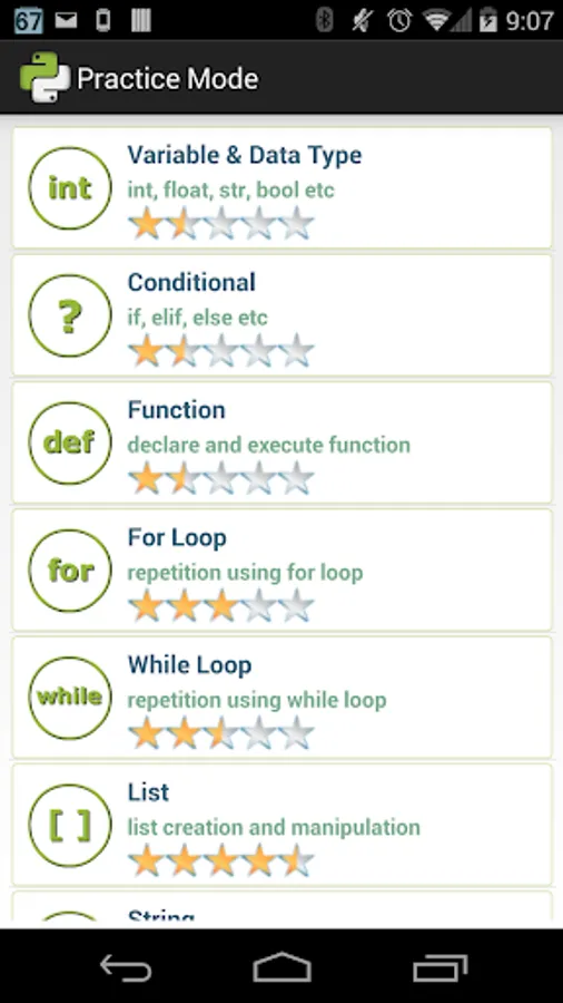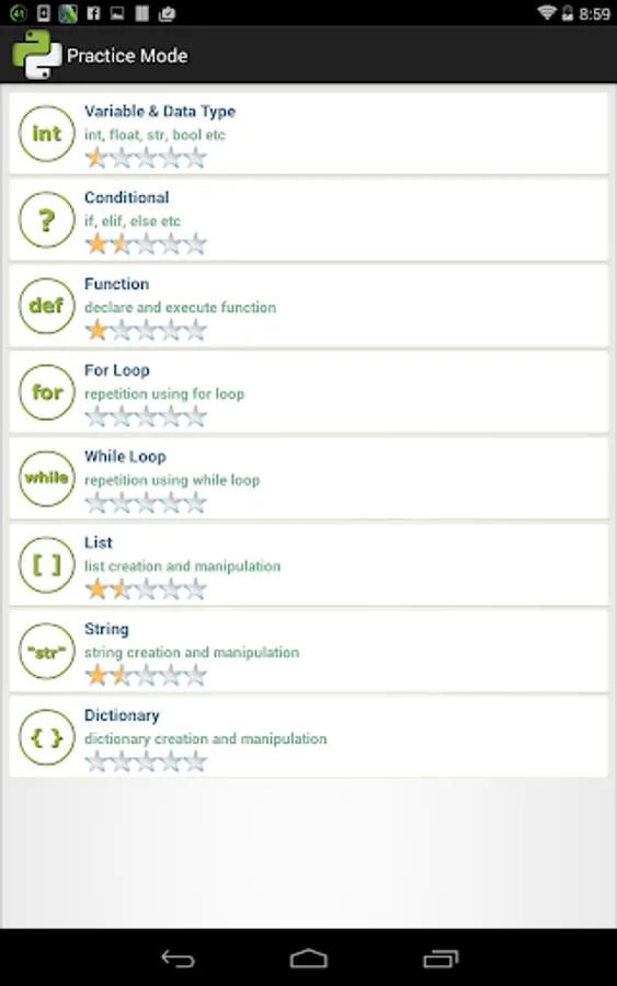 The questions are sorted into different topics. User can choose to practise on their topics of choice.