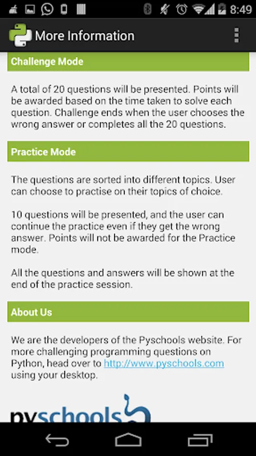 A total of 20 questions will be presented. Points will be awarded based on the time taken to solve each question. Challenge ends when the user chooses the wrong answer or completes all the 20 questions.