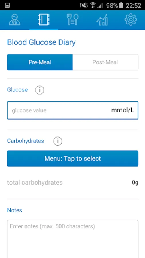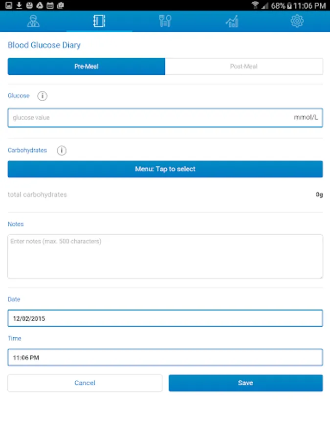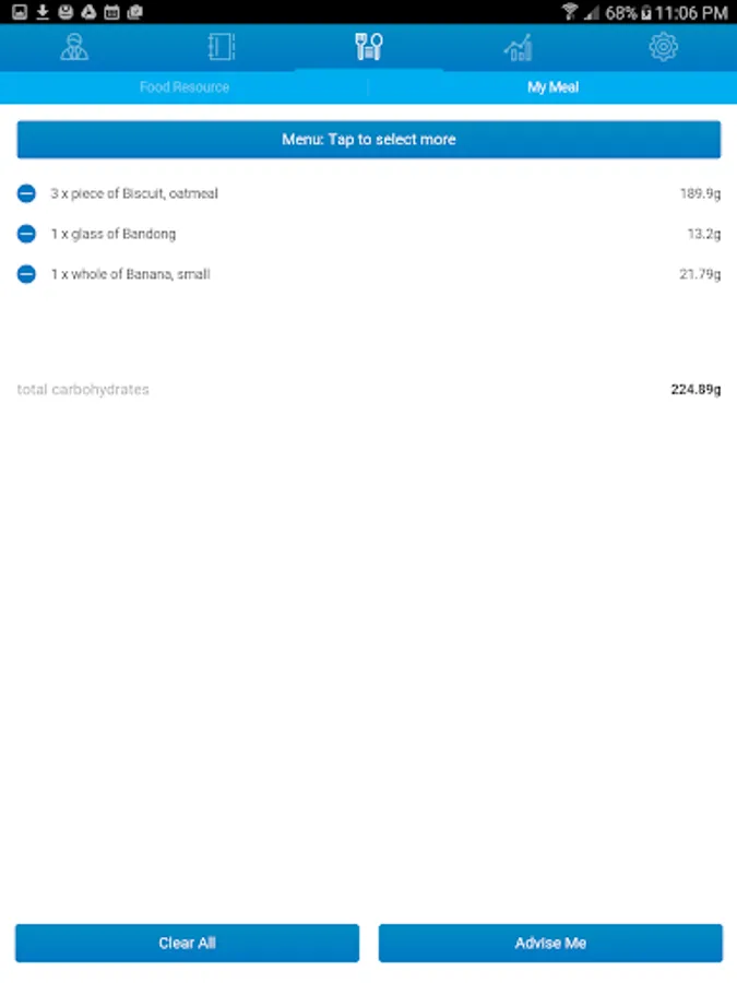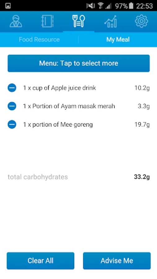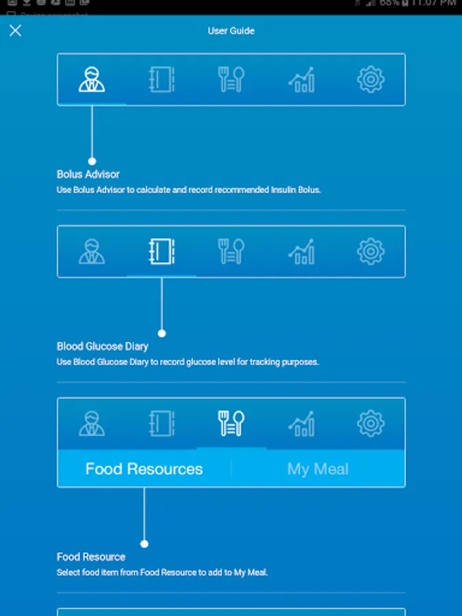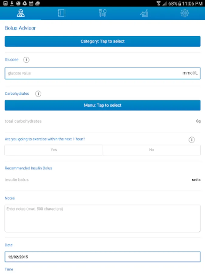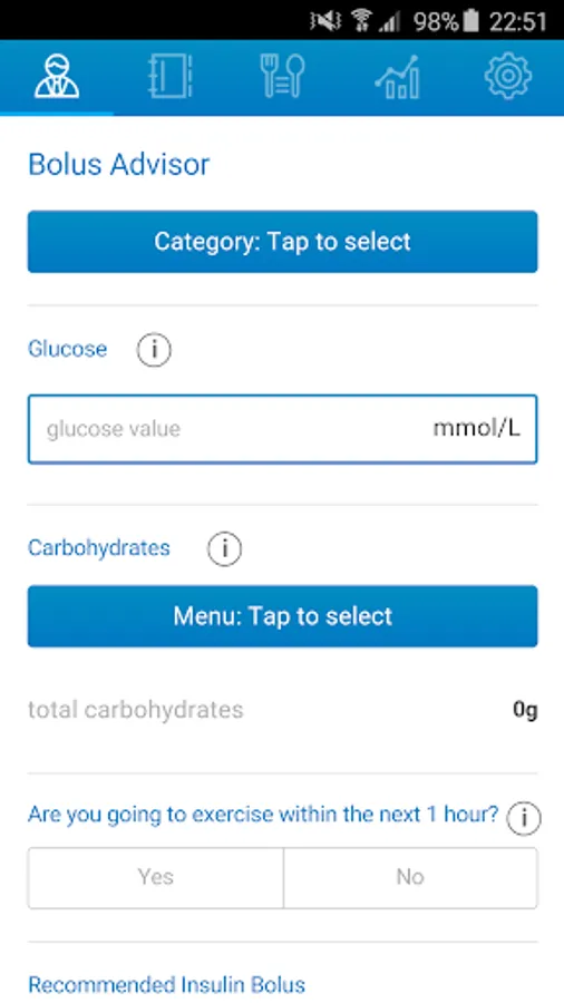 If you have Type 1 diabetes mellitus, the Insulin Bolus Advisor function of the app advises you on how much bolus insulin you should give when you enter your blood glucose and the food you are going to have for the meal. If you are planning to exercise within an hour of the insulin injection, the insulin bolus calculator aids you in recommending a reduced dose of bolus insulin according to your weight, the duration of exercise, and the type of exercise you are planning to do.