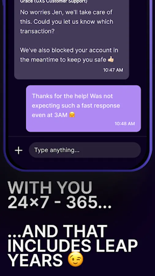 Drop us a line 24x7 and let our 100% Human Team help you out (we’re all about that human touch!). Have a question? Visit our Help Centre at help.gxs.com.sg or login to the GXS app and chat with us for account-related matters.