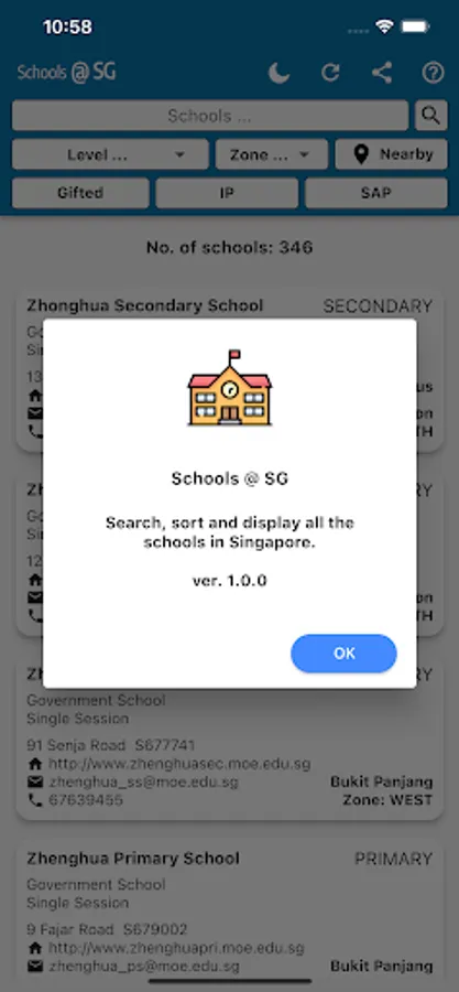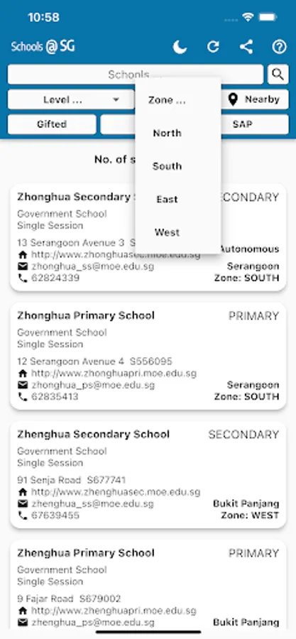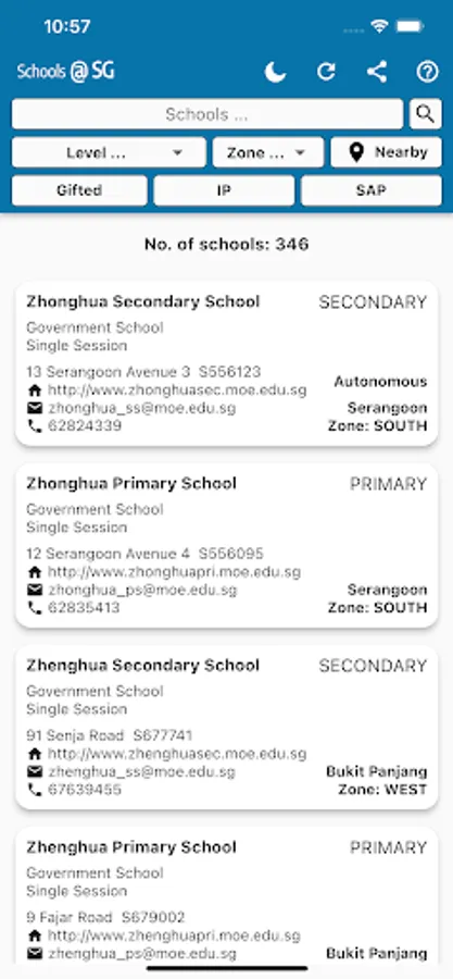 Schools SG. Display Primary School, Secondary School, Junior College and Mixed schools. Sort based on Gifted, IP and SAP etc. Display schools within certain distance from your location ( Within 1km, 1km - 2km, Within 2km).