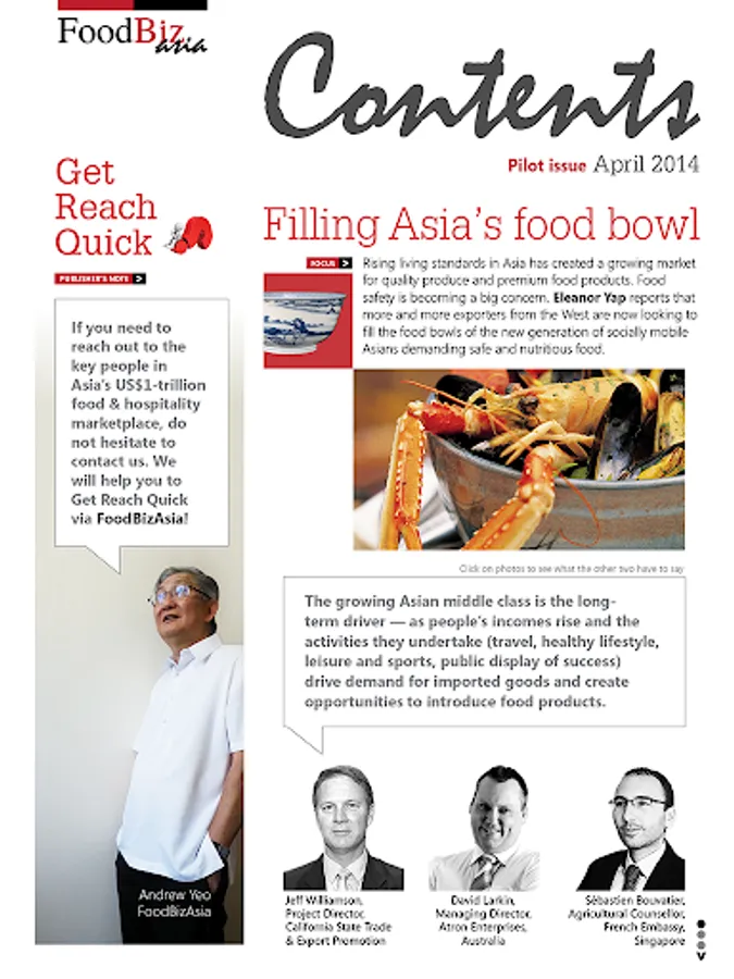 The April 2014 issue of FoodBizAsia is just a pilot edition launched at Food & Hotel Asia exposition held in Singapore from 8-11 April 2014. As the professionals we surveyed indicated that they want the new B2B foodbiz magazine to follow them everywhere on their connected mobile devices, we have decided to go fully digital.