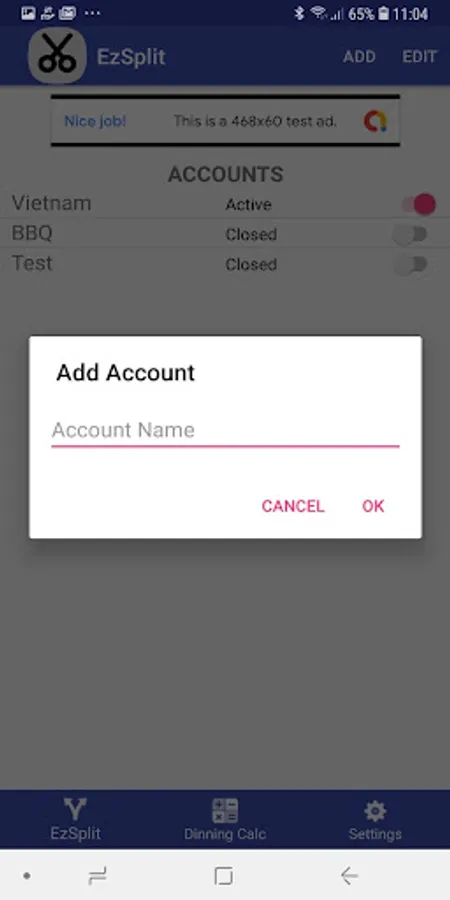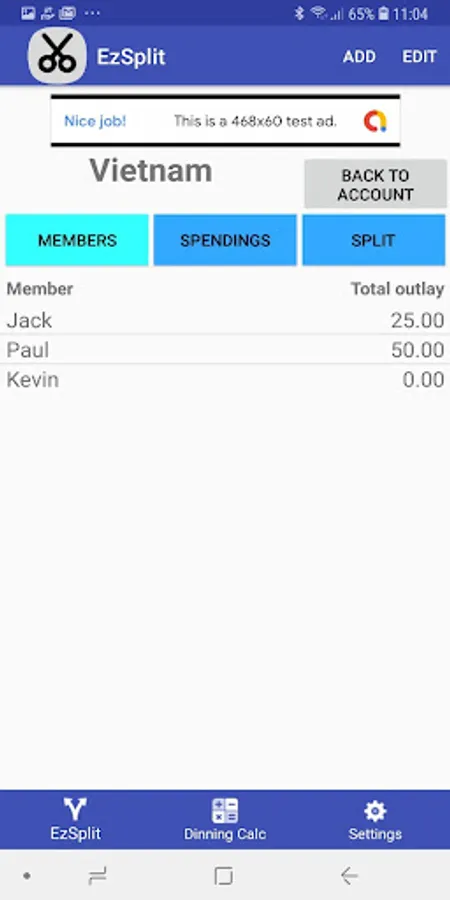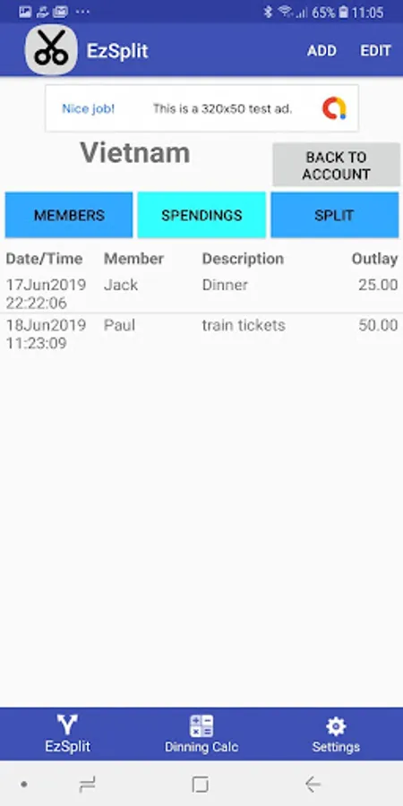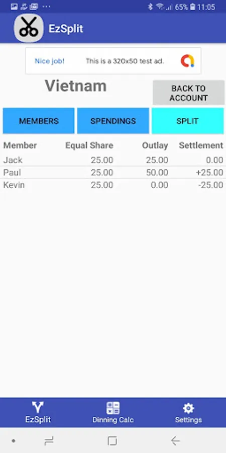 Simply create an account, add members to the account and start recording expenses incurred by each members, when ready to settle simply hit the split button. Each member equal share and differences are automatically calculated. After settlement, you can turn off the account or simply delete it.
