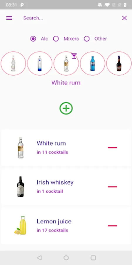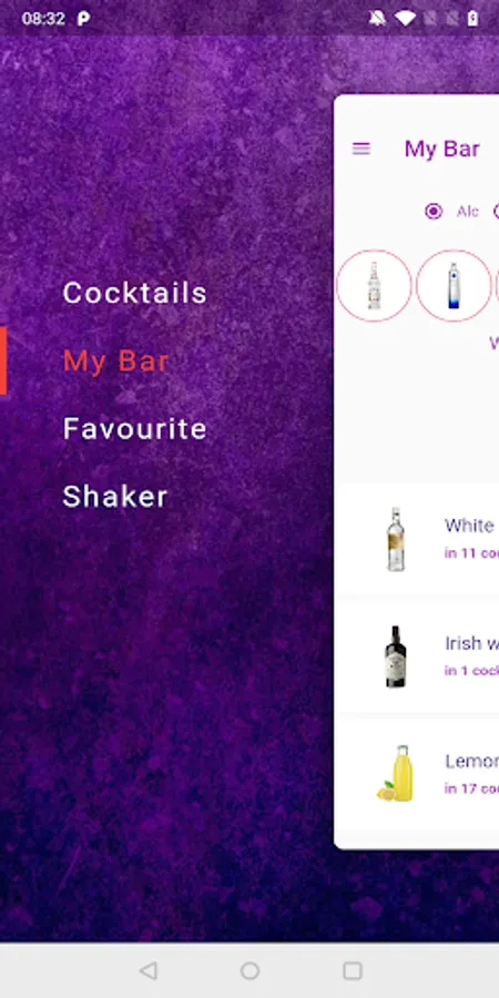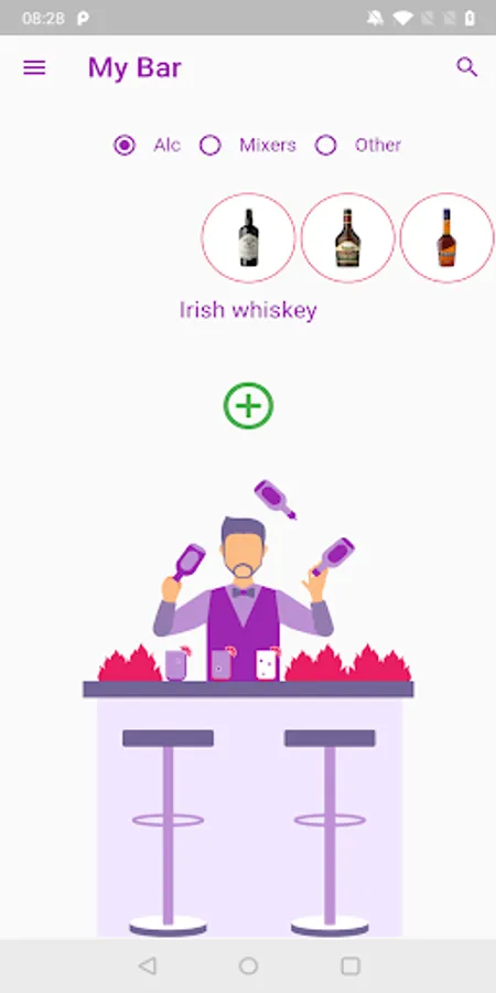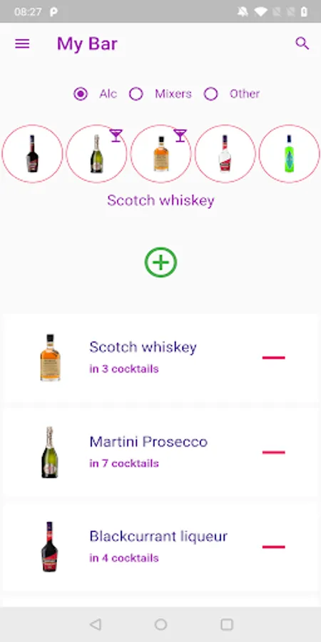For convenience, drinks in “My Bar” are divided into three categories: alcoholic, mixers (syrups, juices, other drinks) and others (fruits, sauces, spices, etc.)