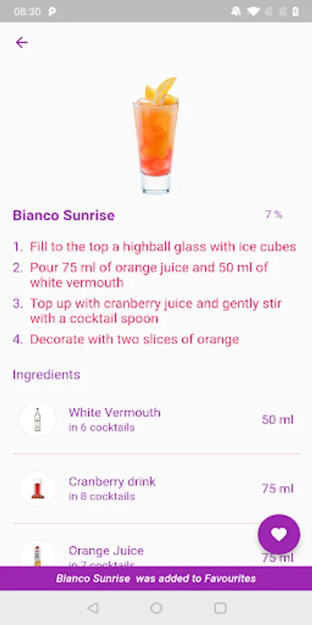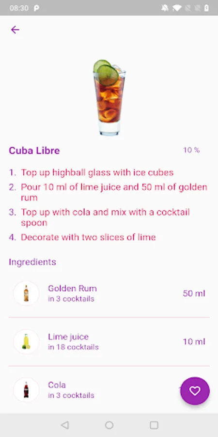 List of favorite cocktails in the "Cocktail Rush" app. To add to this list of cocktails you can select the cocktail you are interested in on the "Cocktails" page, display detailed information about the cocktail on the screen. For example, selecting the cocktail "Mojito raspberry", the app will display: a colorful image of the cocktail, the name of the cocktail, the amount of alcohol in the cocktail, followed by a step-by-step guide on how to prepare the cocktail "Mojito raspberry" and a list of ingredients with the images and their quantity in the cocktail, right above the image of a cocktail there is floating button "Add a cocktail to your favorite" with a picture of a heart.