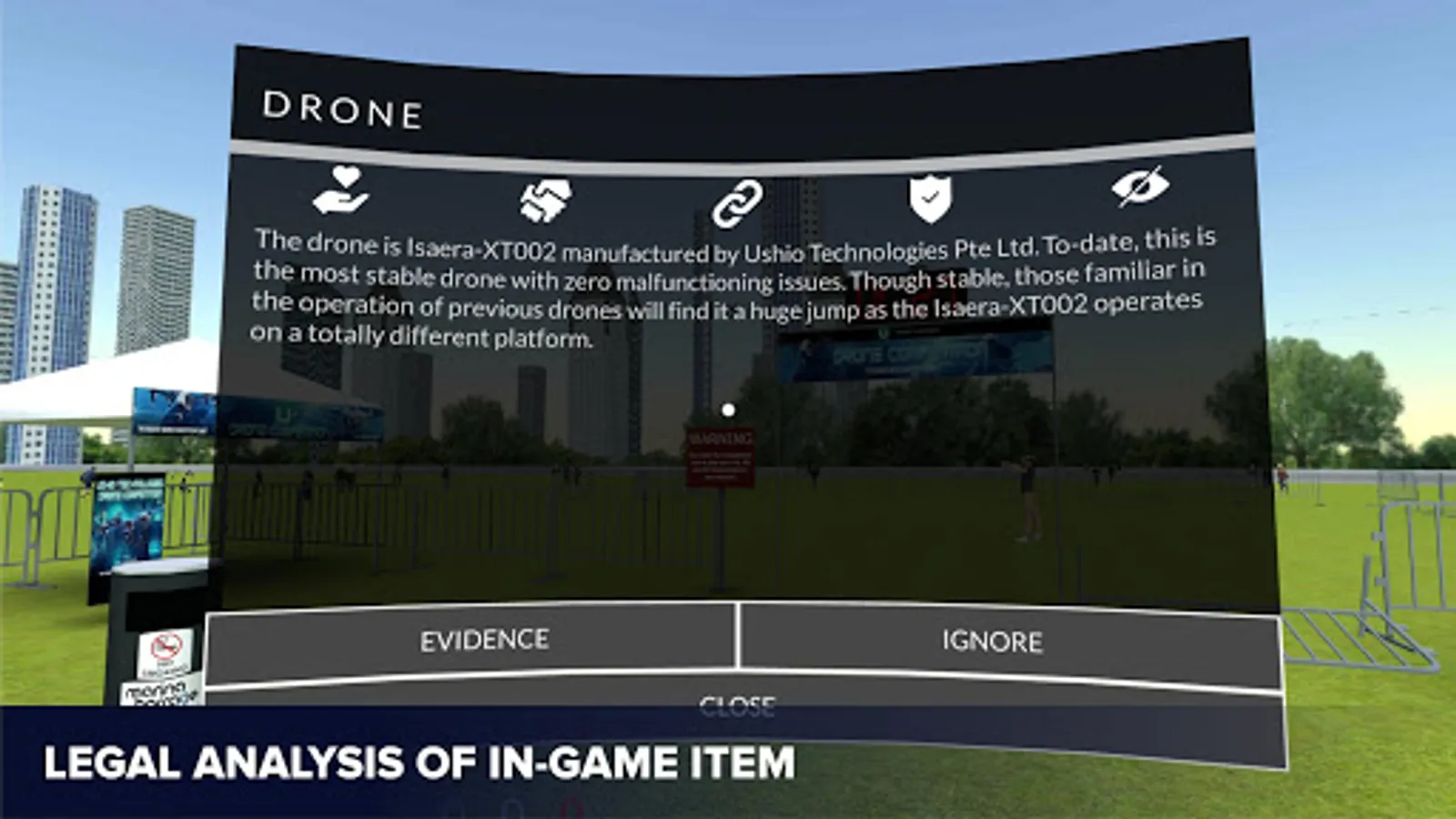 Take charge of your case as you step into the shoes of a plaintiff in an incident! “Mind the Drone” is a Virtual Reality Experience developed for the School of Law in Singapore Management University. The app aims to provide immersive virtual learning environment for students to better appreciate the application of tort legal principles to real-life situations and circumstances. Students interact with the items and people in the case to select and curate relevant evidence in order to make an informed determination on whether tortious liability has been made out, and to what extent.