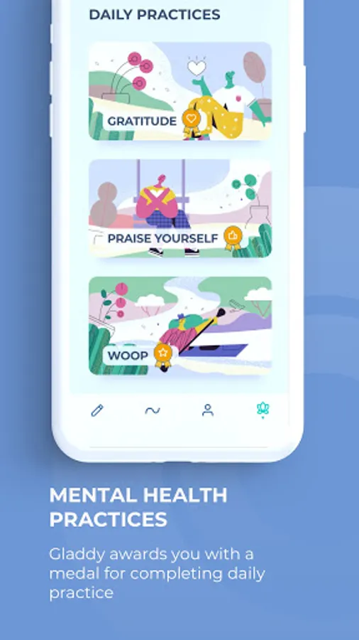 Your wellness, self-understanding and mindfulness matters to Gladdy the most, If Gladdy notices that you need a support it will encourage you with some inspiring words or offer you to take one of powerful daily metal practices to improve you mental well-being and cheer you up.