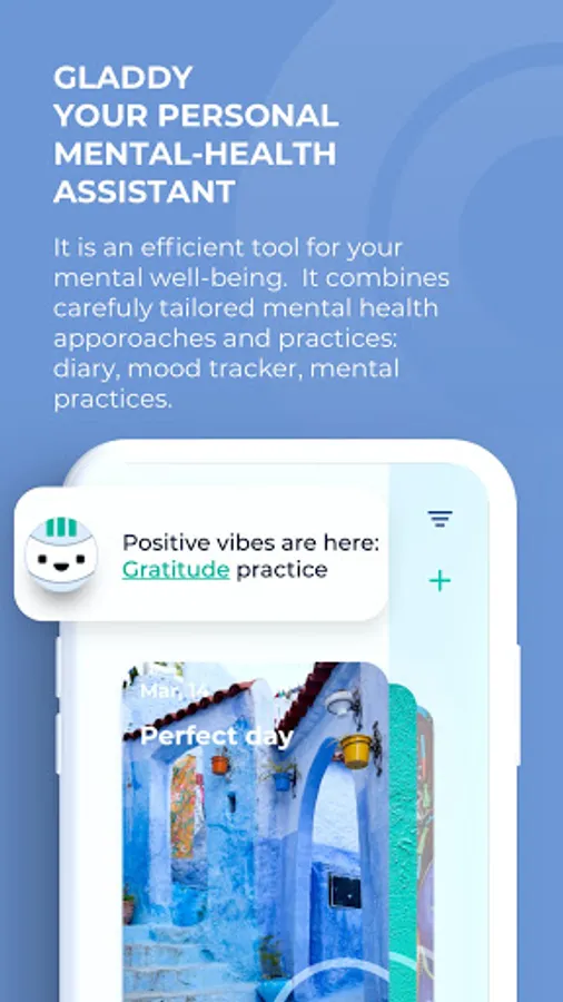 GLADDY - is an efficient tool for your mental well-being, it combines carefully tailored mental health approaches and practices: passcode protected diary, mood tracker, mental practices. Altogether fused into a beautifully designed single app, where Gladdy acts like your personal, emotional health assistant, that enjoys your achievements and gives you a hand when you are in need to.