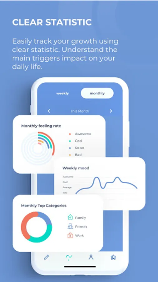 Add stories of what's important to you the most: relationship, travelling, work or any other aspect of your life, associate it with your current mood, so that Gladdy will analyze your records to detect your emotional triggers. Explore the patterns in your mood by checking statistical graphs to help you better understand your thoughts and feelings.