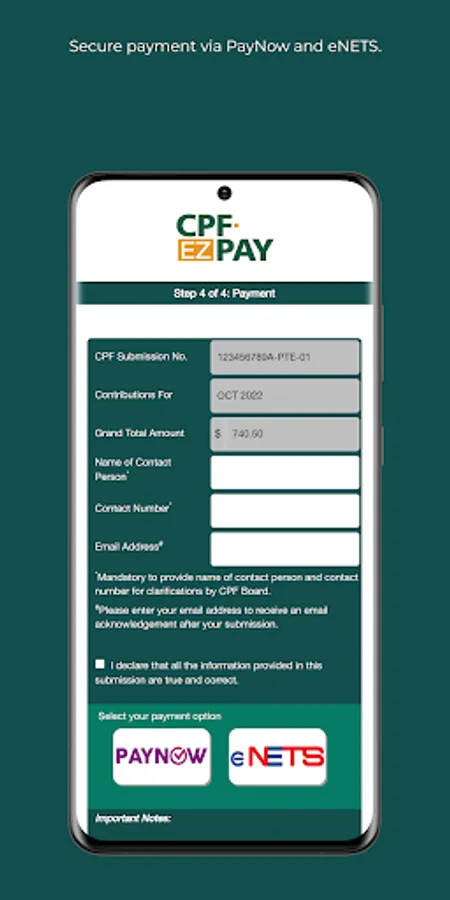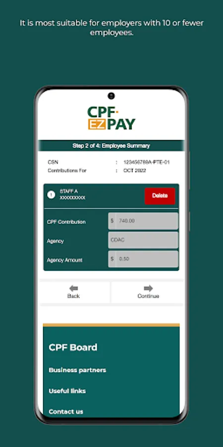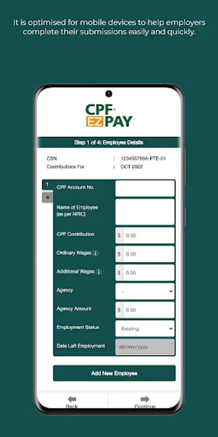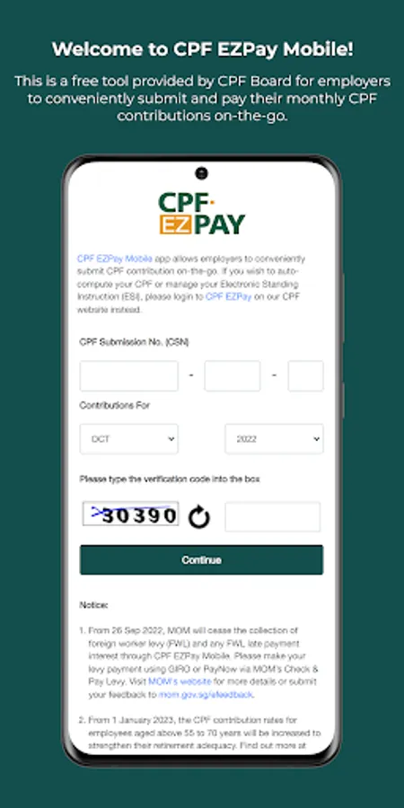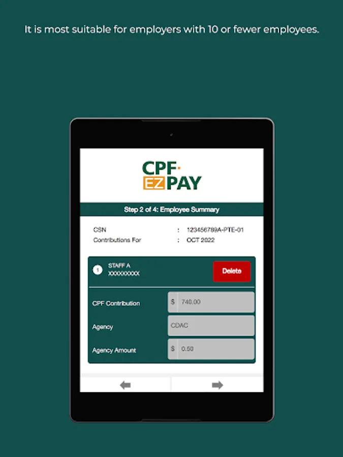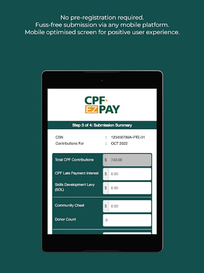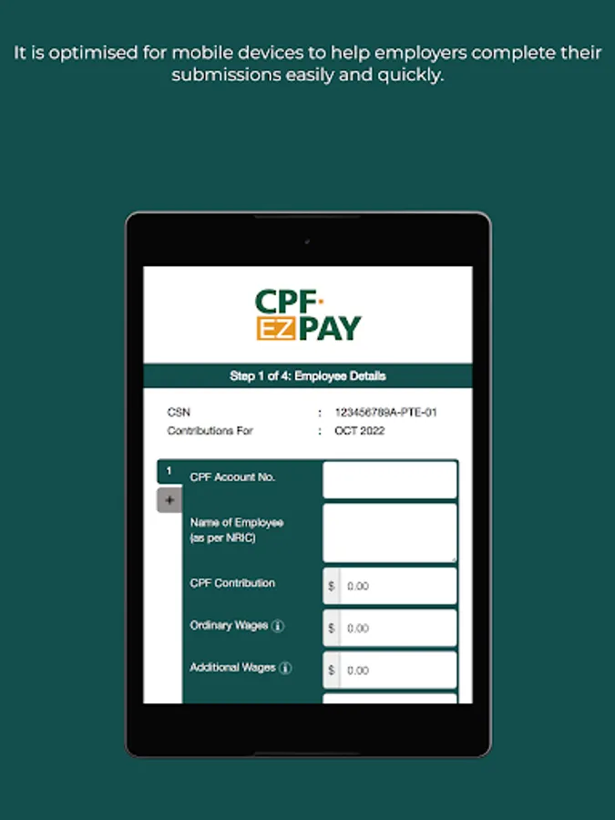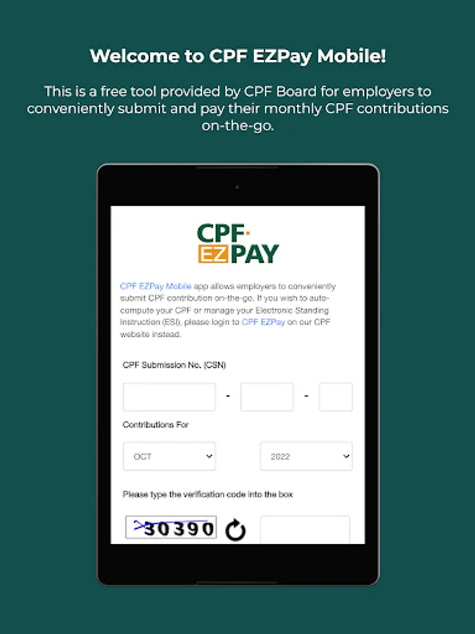 CPF EZPay Mobile is a free tool provided by CPF Board for employers to conveniently submit their monthly CPF contributions on-the-go. It is optimised for mobile devices to help employers complete their submissions easily and quickly. It is most suitable for employers with 10 or fewer employees.
