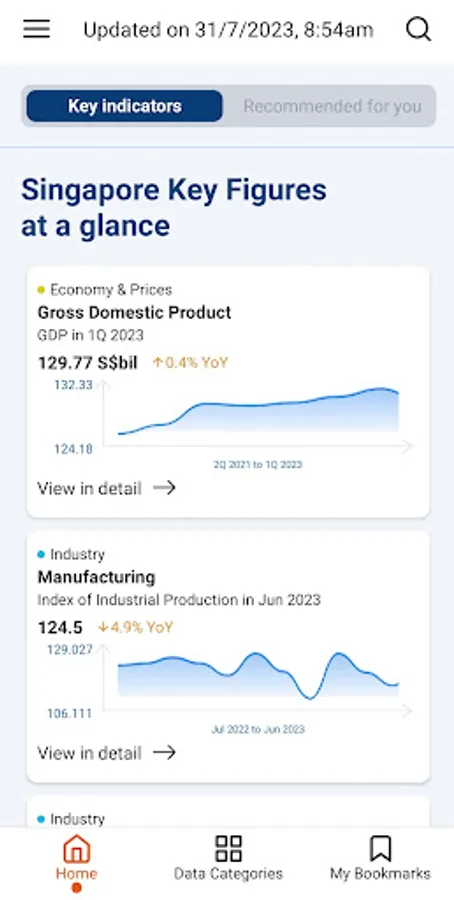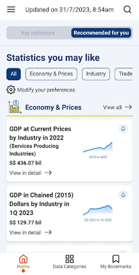 Get access to commonly referenced statistics from the enhanced SingStat Mobile App. The app brings you new and improved features to enhance your data exploration experience with over 260 charts spanning across 38 categories such as GDP, Population, Prices, Households, Services and more. Receive personalised data recommendations and useful information based on your indicated profile and data interest. Get a quick preview of the key indicators, explore data by navigating through intuitive data categories or improved keyword search. Stay up-to-date with notifications on data updates by subscribing to the indicators of interest. Visualise data in various interactive chart types with tooltips, and customise charts and bookmark for future references. Share charts via social media and download tables for further analyses of data trends. Access related information such as publications, methodologies, glossaries and historical data series in the SingStat Table Builder, and enjoy seamless access across all your devices with cross-device synchronisation.