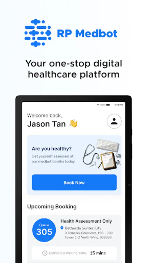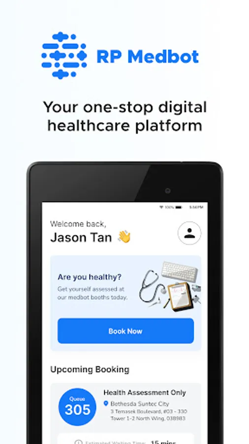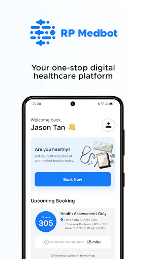 The RP Medbot QMS app is your one-stop digital healthcare platform to get queue numbers at your selected healthcare facility, followed by independently taking your BMI, blood oxygen level, and blood pressure before your consultation. You can also access your health records with this app.