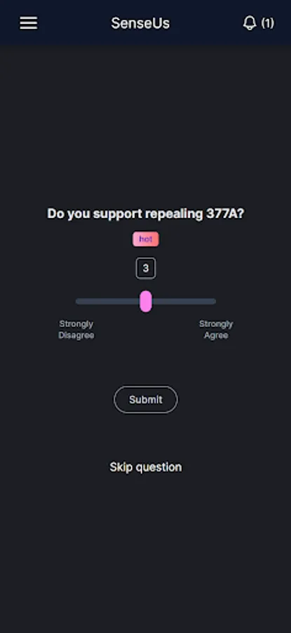 Ever wondered how others feel about a particular issue, but not sure where and how to ask? SenseUs gives you the power to do so. We're all about asking sensitive and sensible questions that matter. Through our curated list of topics, we strive to let you see how similar and different your views may be with the people around you. Ask, answer, and discover - take that step towards a better sense of the world around us.